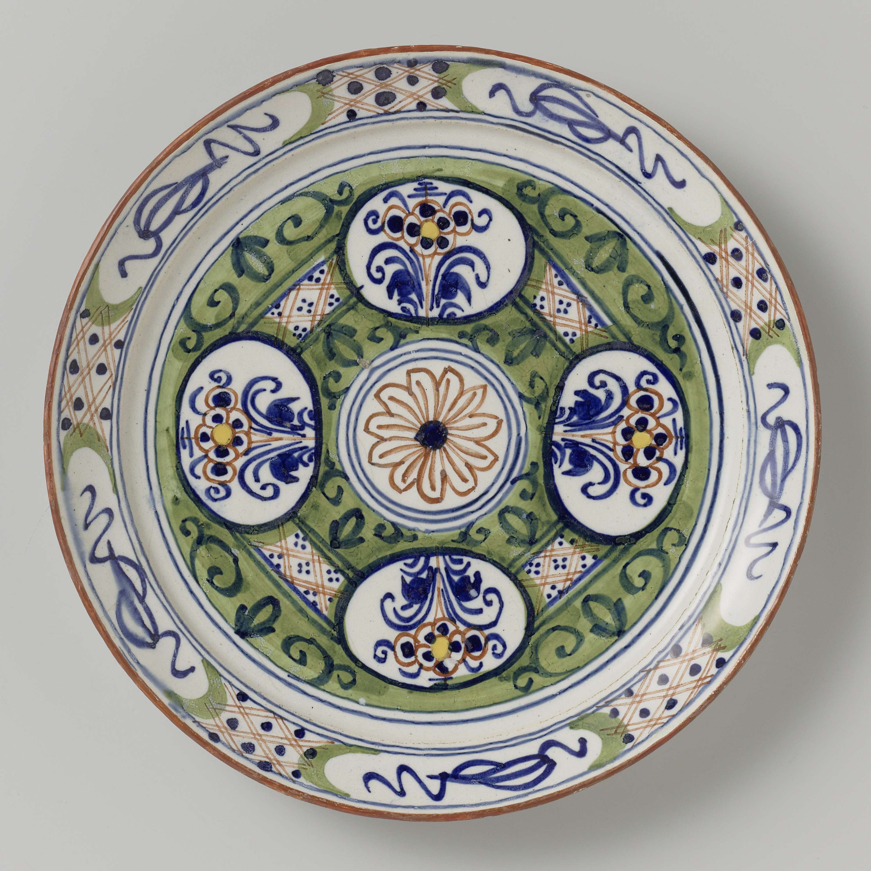 Rond bord van veelkleurig beschilderde faience, met op het plat een cirkel waarbinnen een ster. Daar omheen vier veelkleurige ovale medaillons met een bloementak. Op de rand is een Chinees motief geschilderd. (Nederlands)