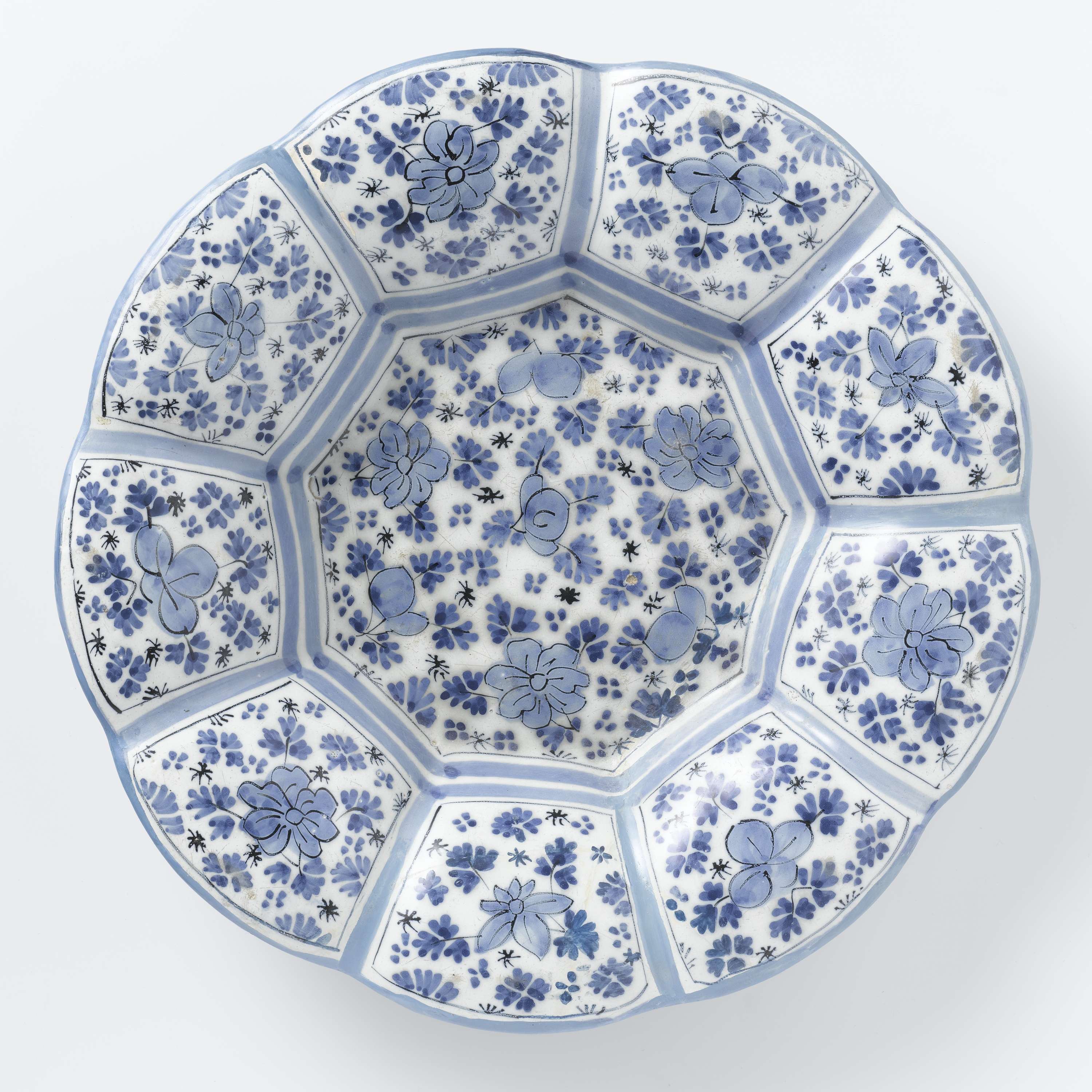 | Nederlands | Schotel met negenlobbige rand van blauw beschilderde faience |