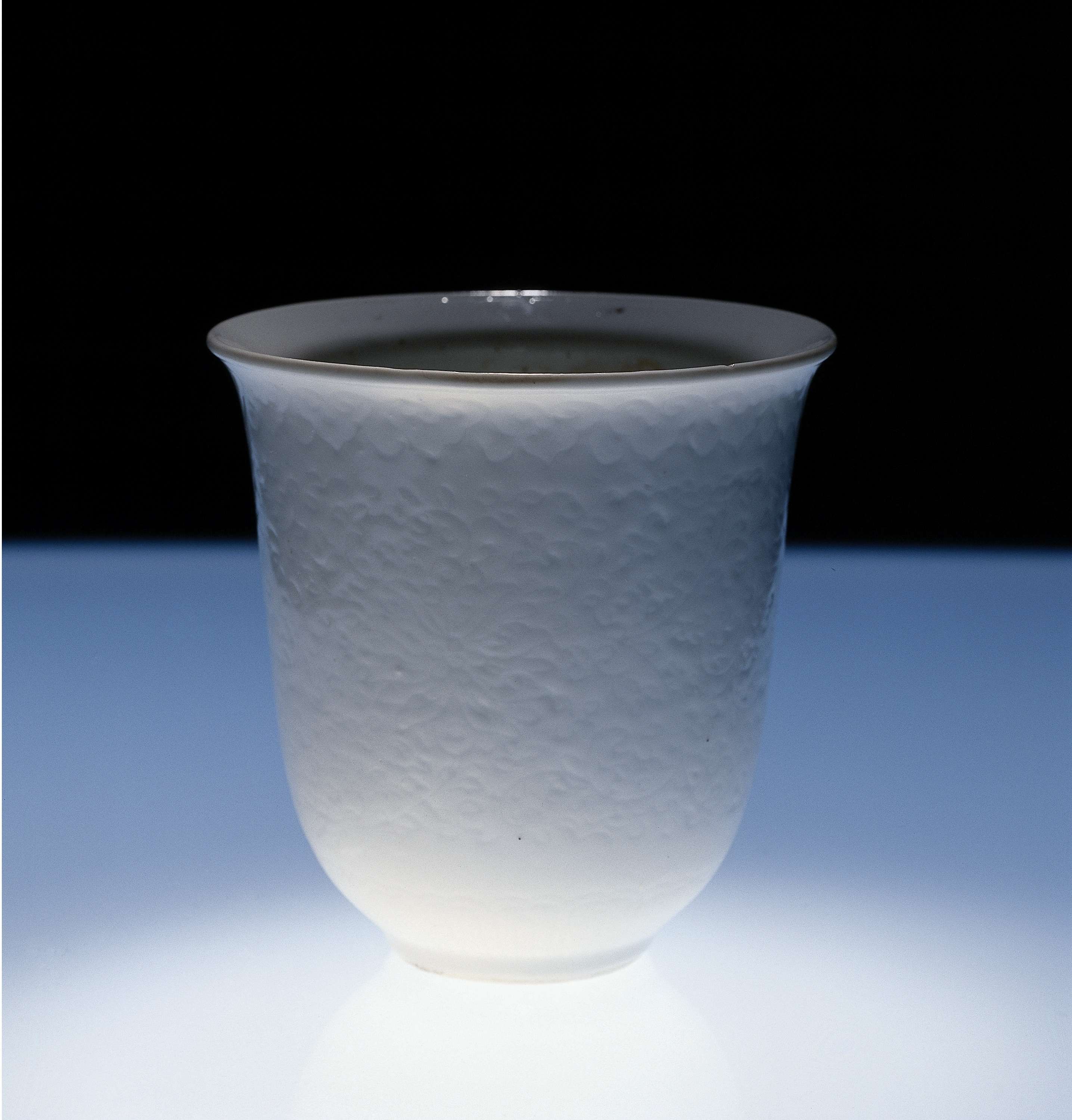 Hoge, klokvormige kom van porselein. De buitenwand is bedekt met ingegrifte lotusranken. Op de buitenrand een band met ruyi-motieven. Rond de voet een band met bladmotieven. Gemerkt op de onderzijde met het vier-karaktermerk van keizer Chongzhen. Monochromen. (Nederlands)