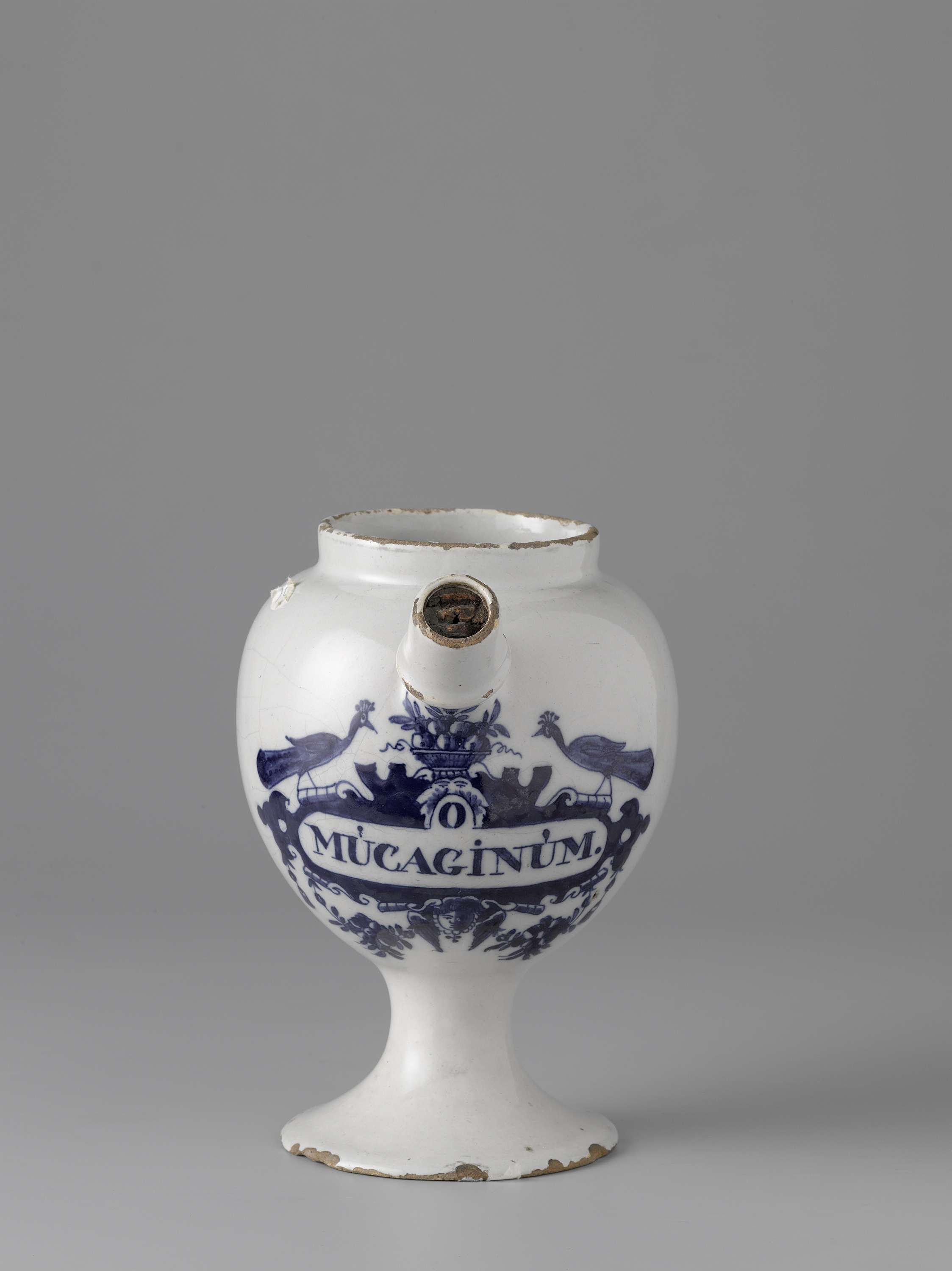 Apothekerspot van blauw beschilderde faience met opschrift: O/ MUCAGINUM. De pot staat op een voet, heeft een oor en een tuit. De pot is gemerkt: LPK. (Nederlands)
