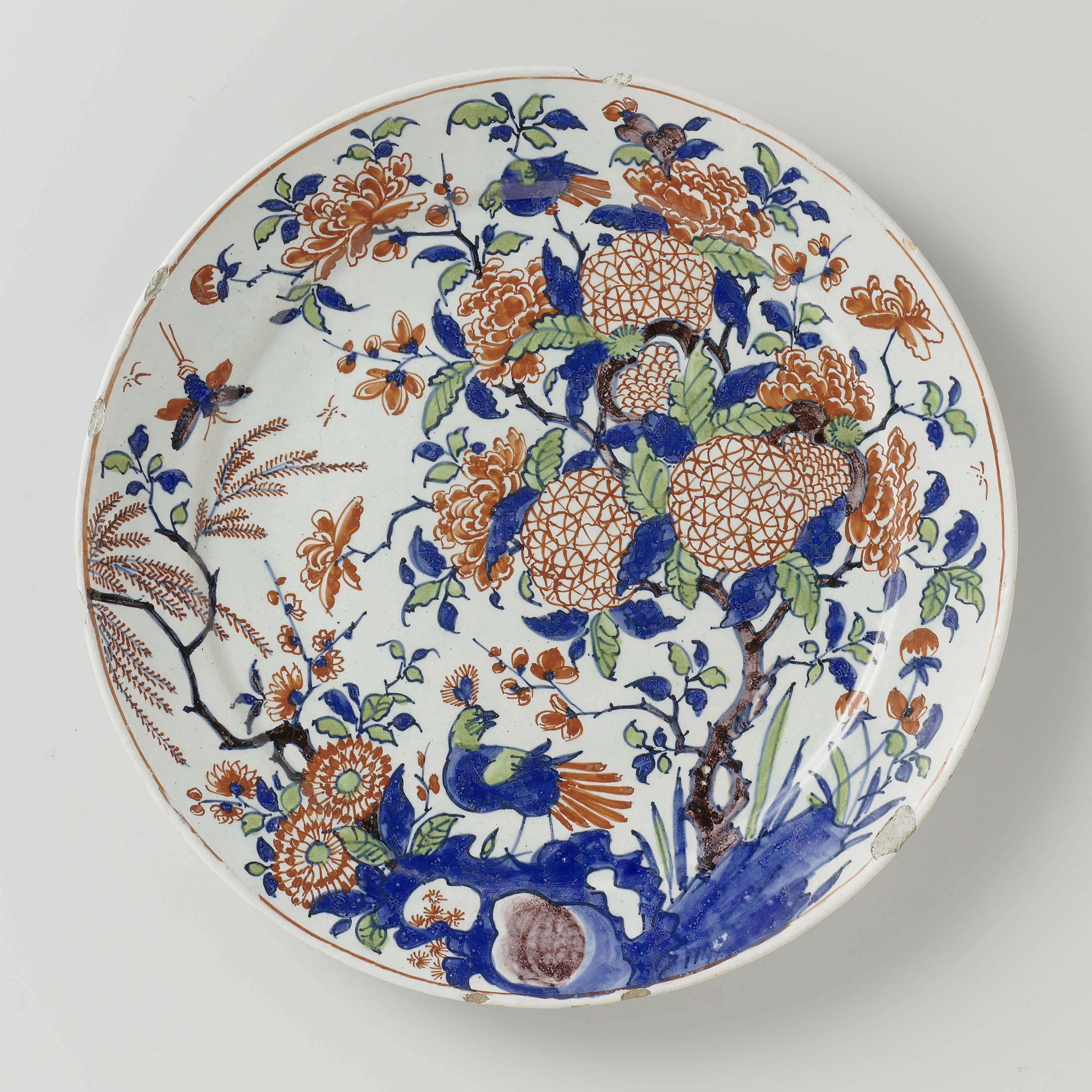 Bord, rond, van aardewerk, aan de voor- en achterzijde met witte tinglazuur gedekt. Voorzijde over het hele bord veelkleurig beschilderd met bloemen, plant en vogel. Op de achterzijde vier ranken. Gemerkt: ROOS. (Nederlands)