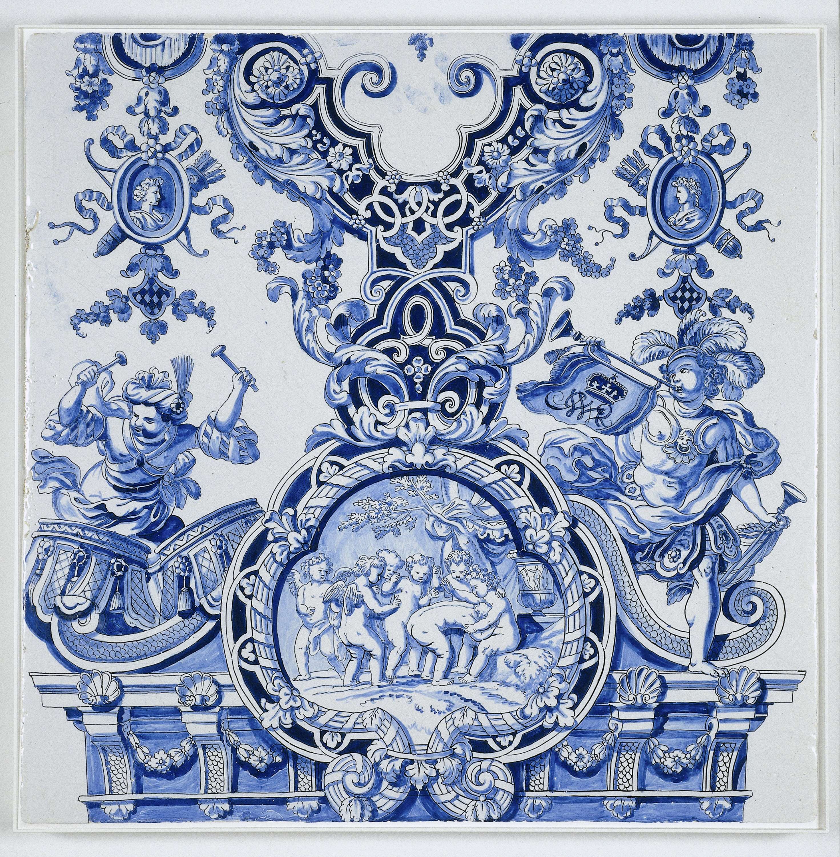 Tegel met een blauw geschilderd medaillon met spelende cherubijnen. Ter weerszijden een trommelslager en een trompetblazer. Aan de bovenkant van de tegel een symmetrisch ornament van voluten en bladranken met aan weerskanten een portret in een medaillon. (Nederlands)