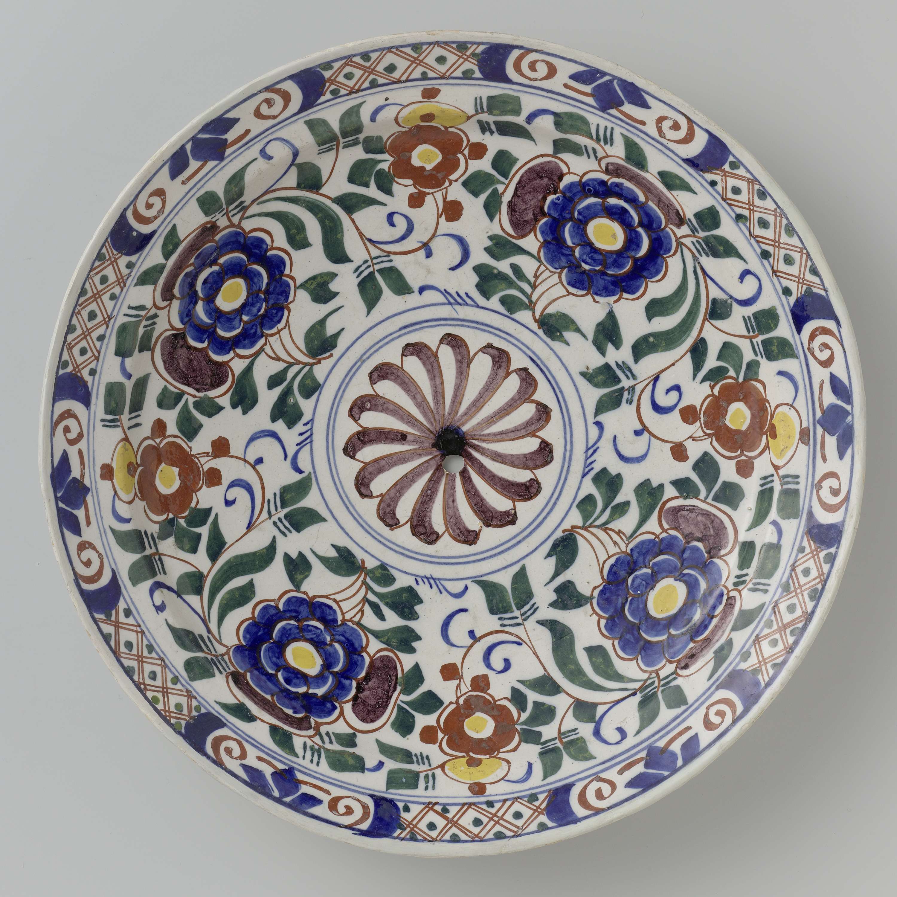Schotel van faience. Veelkeurig beschilderd. (Nederlands)