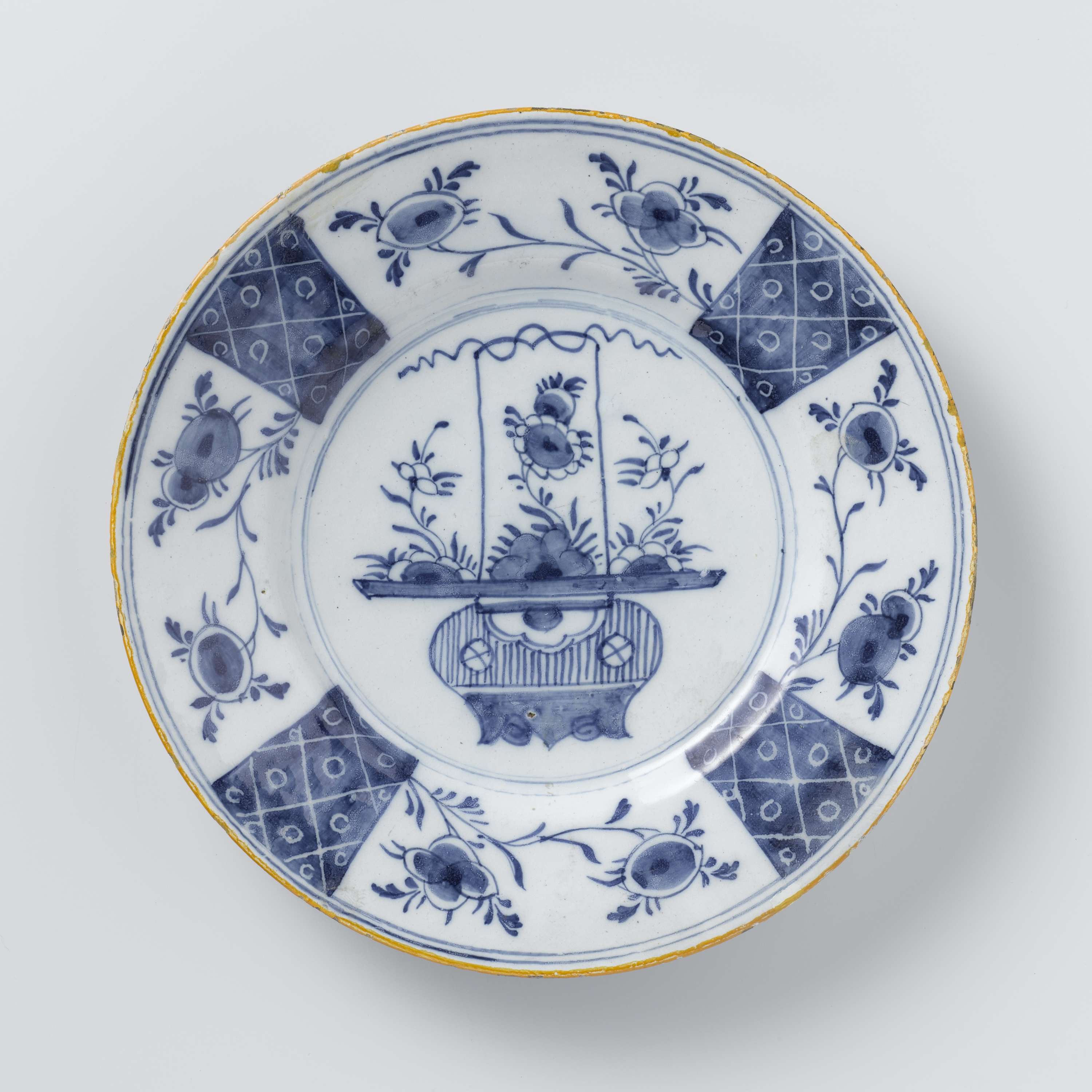 Bord van faience. Blauw beschilderd met bloemdecoraties en een gele bies. (Nederlands)