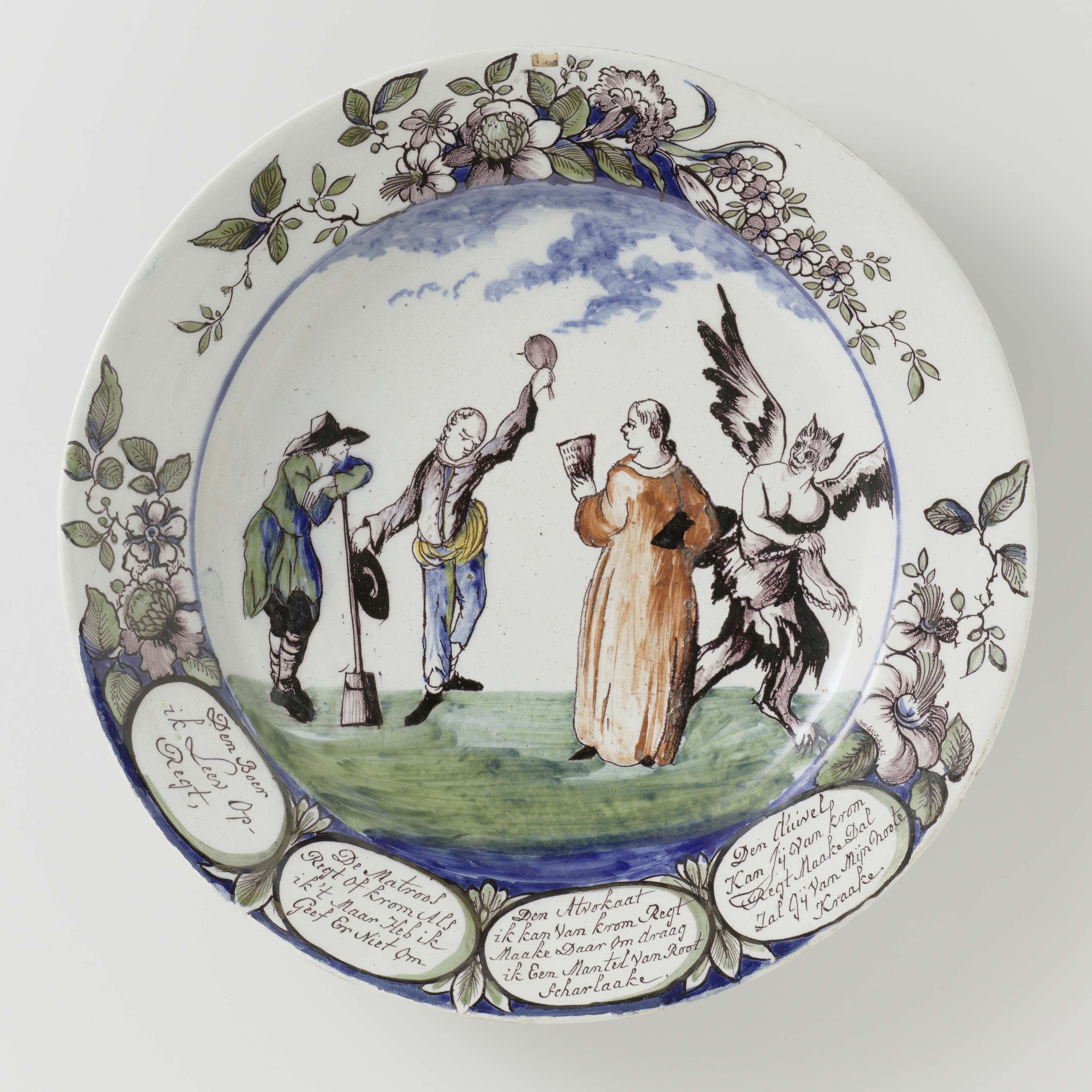| Nederlands | Schotel, beschilderd met een voorstelling die de advocatuur op de hak neemt |