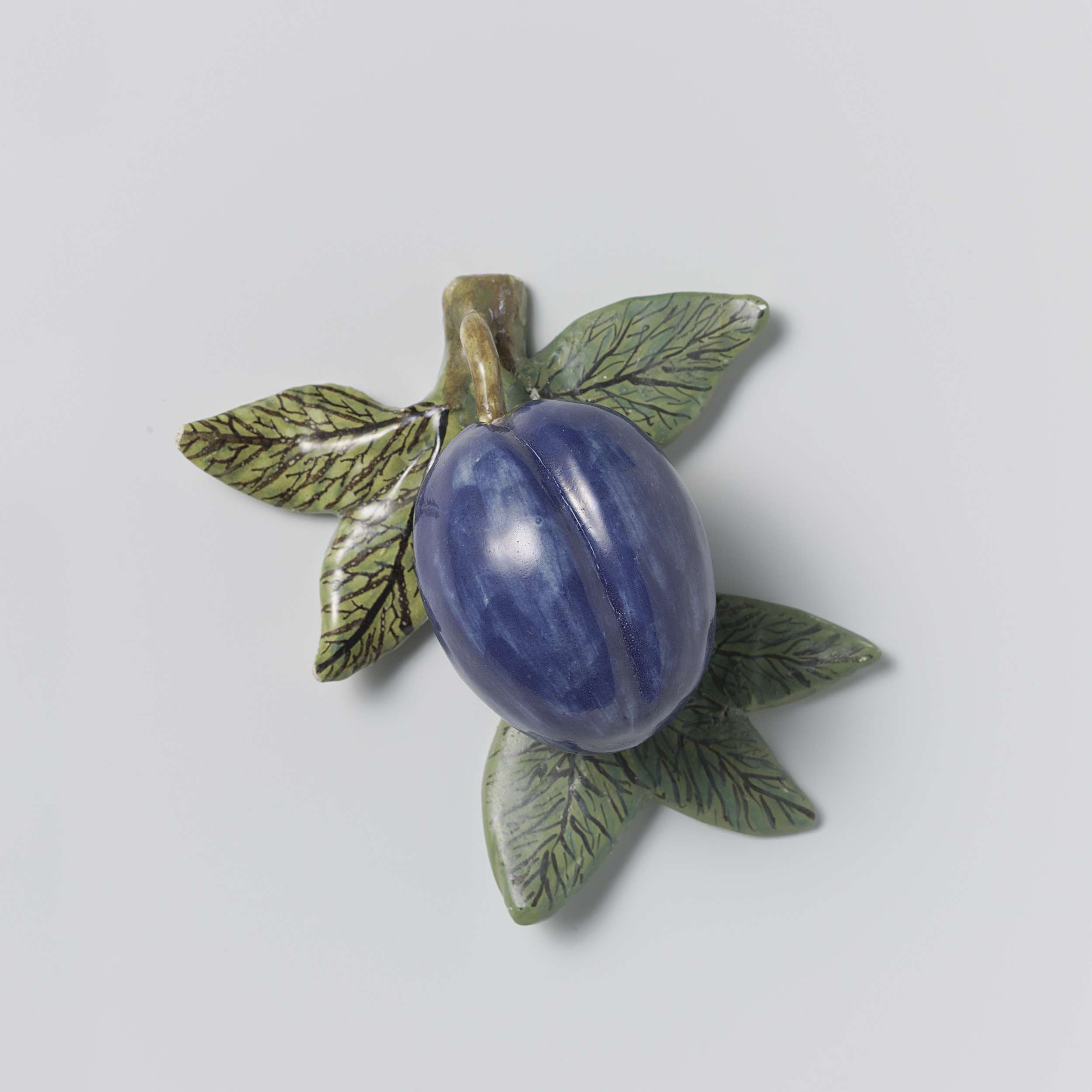 Kunstfruit van faïence, voorstellende een pruim. Veelkleurig beschilderd. (Nederlands)