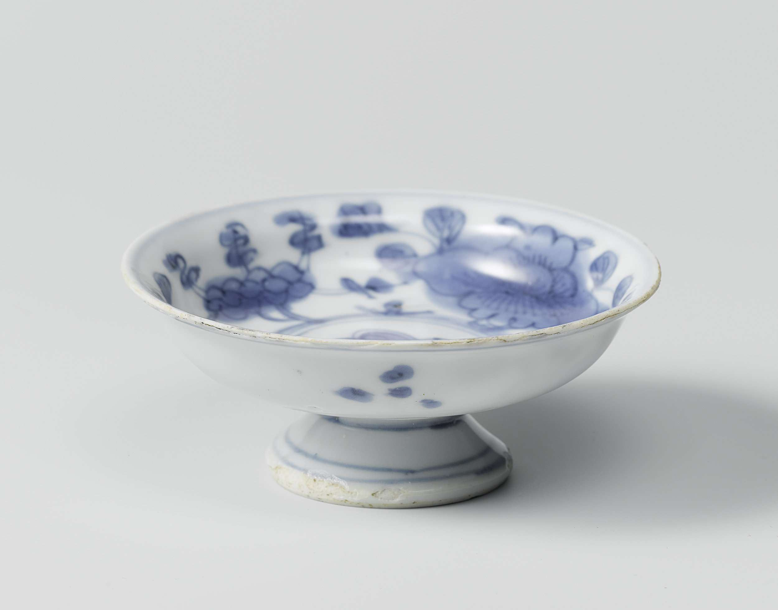 Tazza of schaal op een hoge voet, gedecoreerd in onderglazuur blauw. Op de binnenzijde bloemtakken rond een centraal medaillon met een bloem. (Nederlands)