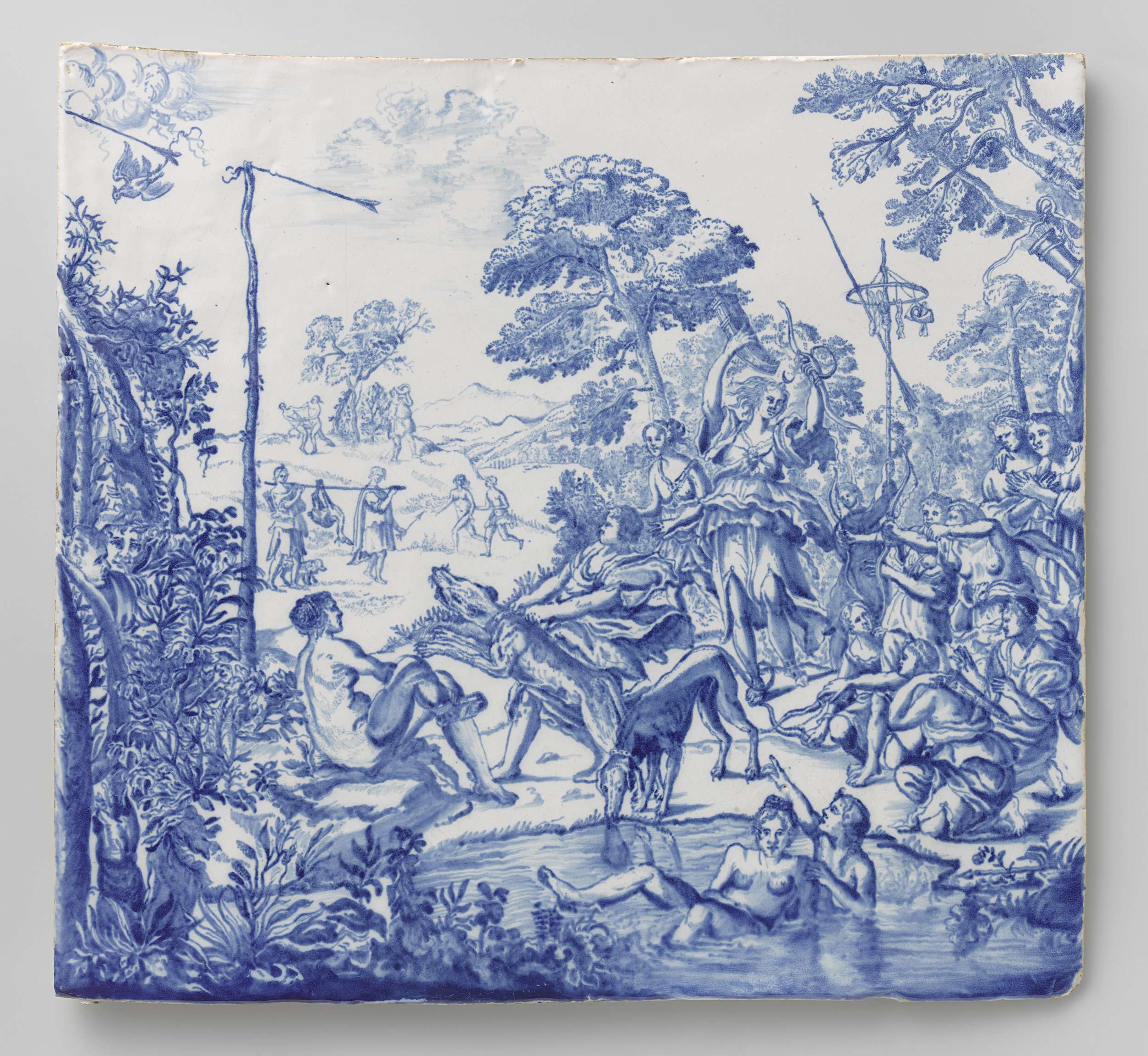 Plaat van faience. Zacht gele scherf, helder wit tinglazuur in blauw beschilderd met een landschap met boompartijen en een vijver waarin Diana met haar gezellinnen op de jacht. Zij worden bespied door twee mansfiguren die zich verschuilen in de bossages. (Nederlands)
