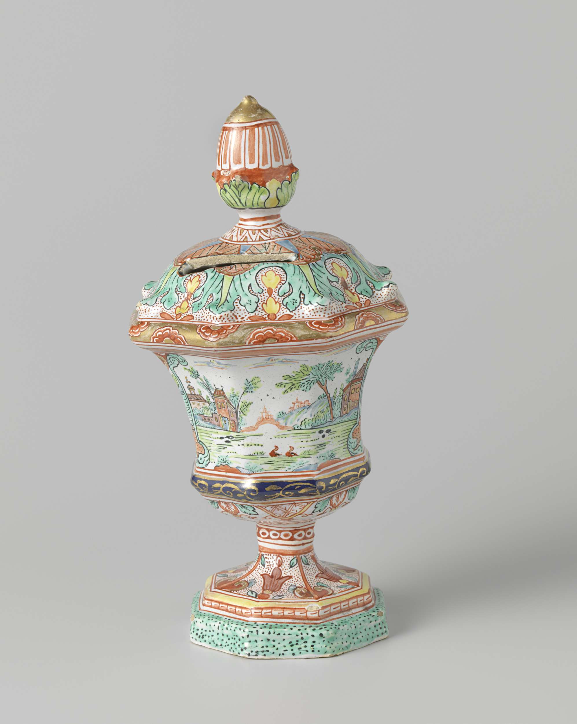 Spaarpot in de vorm van een vaas veelkleurig beschilderd met een waterlandschap. (Nederlands)
