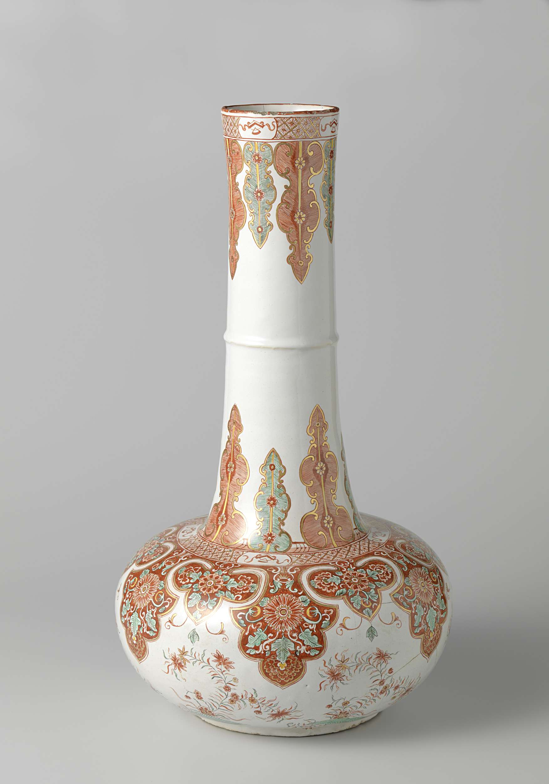 Vaas, bolvormig met lange cilindervormige hals halverwege onderbroken door een ring, veelkleurig beschilderd met afhangende lambrequins. Gemerkt. (Nederlands)