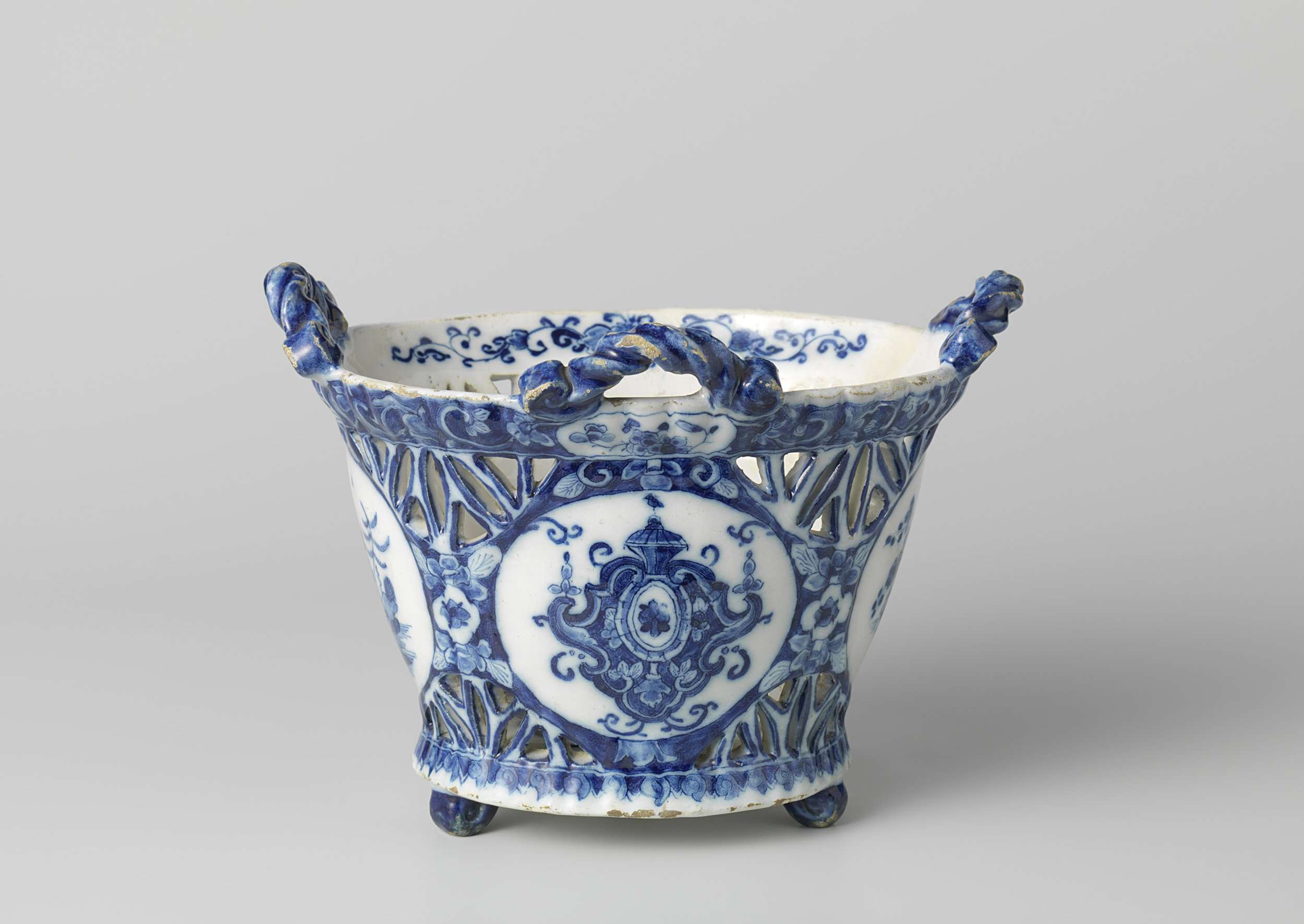 Mand van faïence, met drie oren en opengewerkte rand. In blauw beschilderd met lambrequins en Chinese motieven. (Nederlands)
