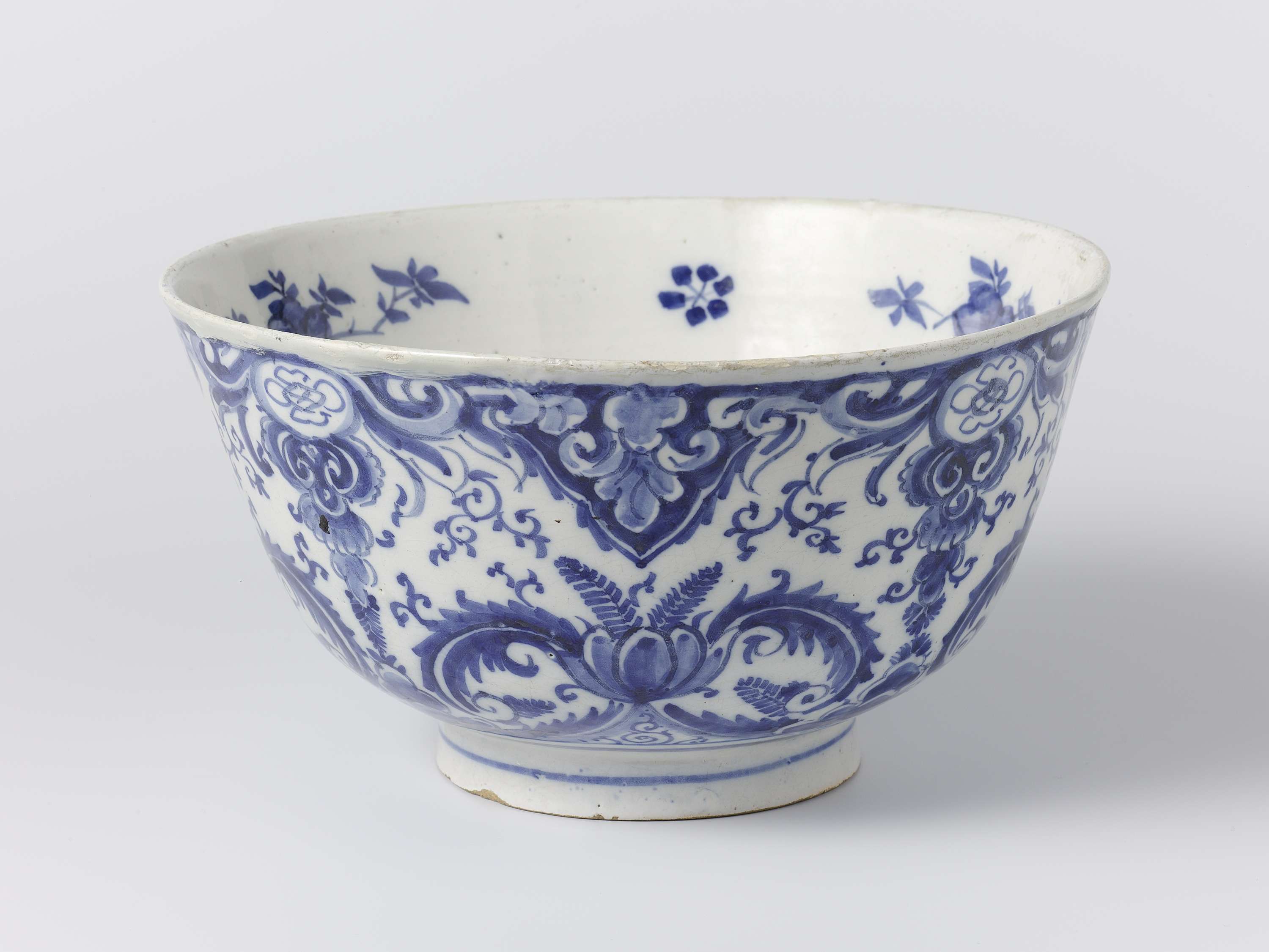 Kom van faience. Blauw beschilderd met blad en bloemdecoraties. (Nederlands)