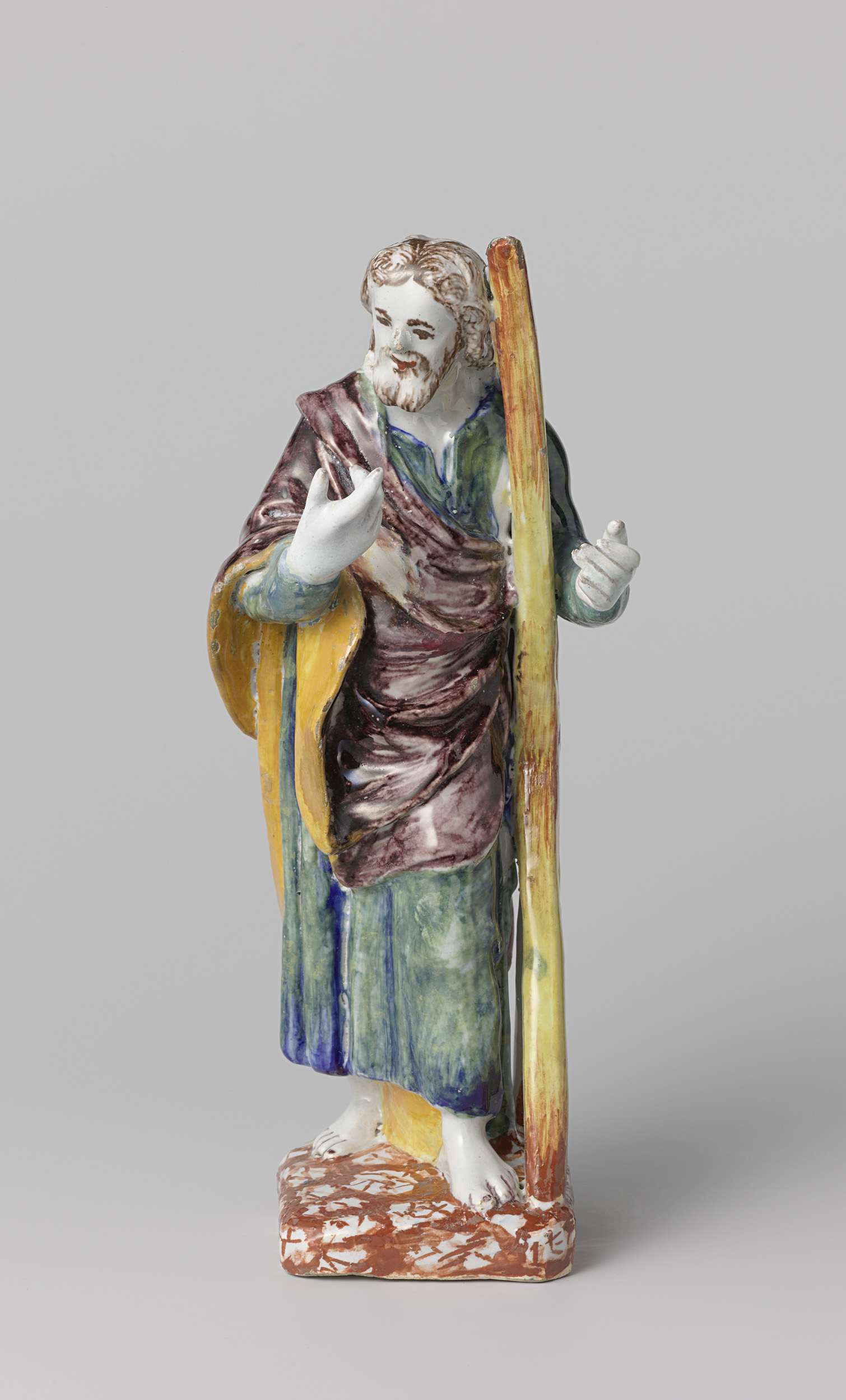 Mannenfiguur van faience, voorstellende een apostel (Andreas) die naast zijn kruis staat. Veelkleurig beschilderd. (Nederlands)
