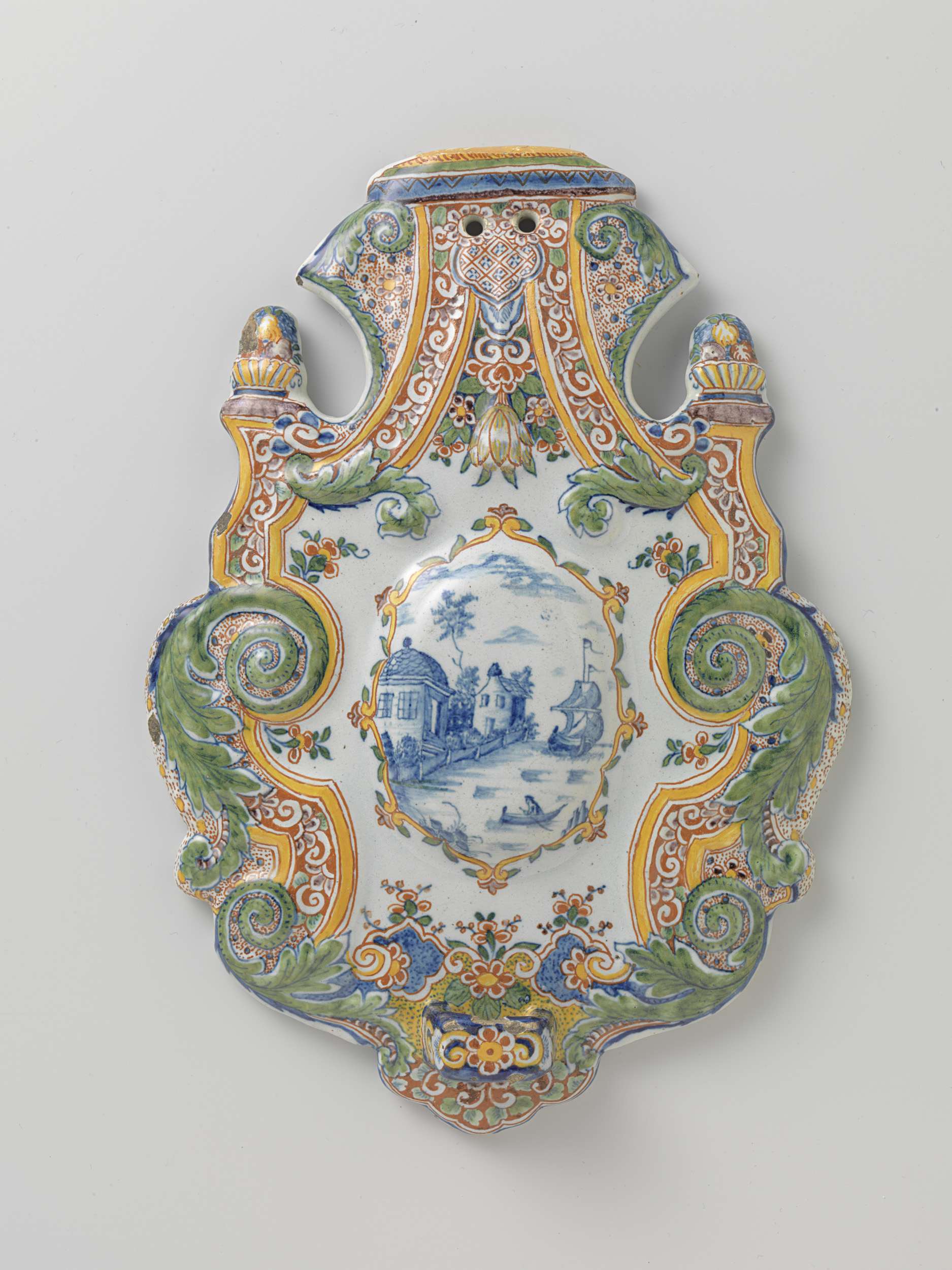 Applique van faïence, cartouchevormig. Veelkleurig gedecoreerd met in het midden een landschap in blauw. (Nederlands)