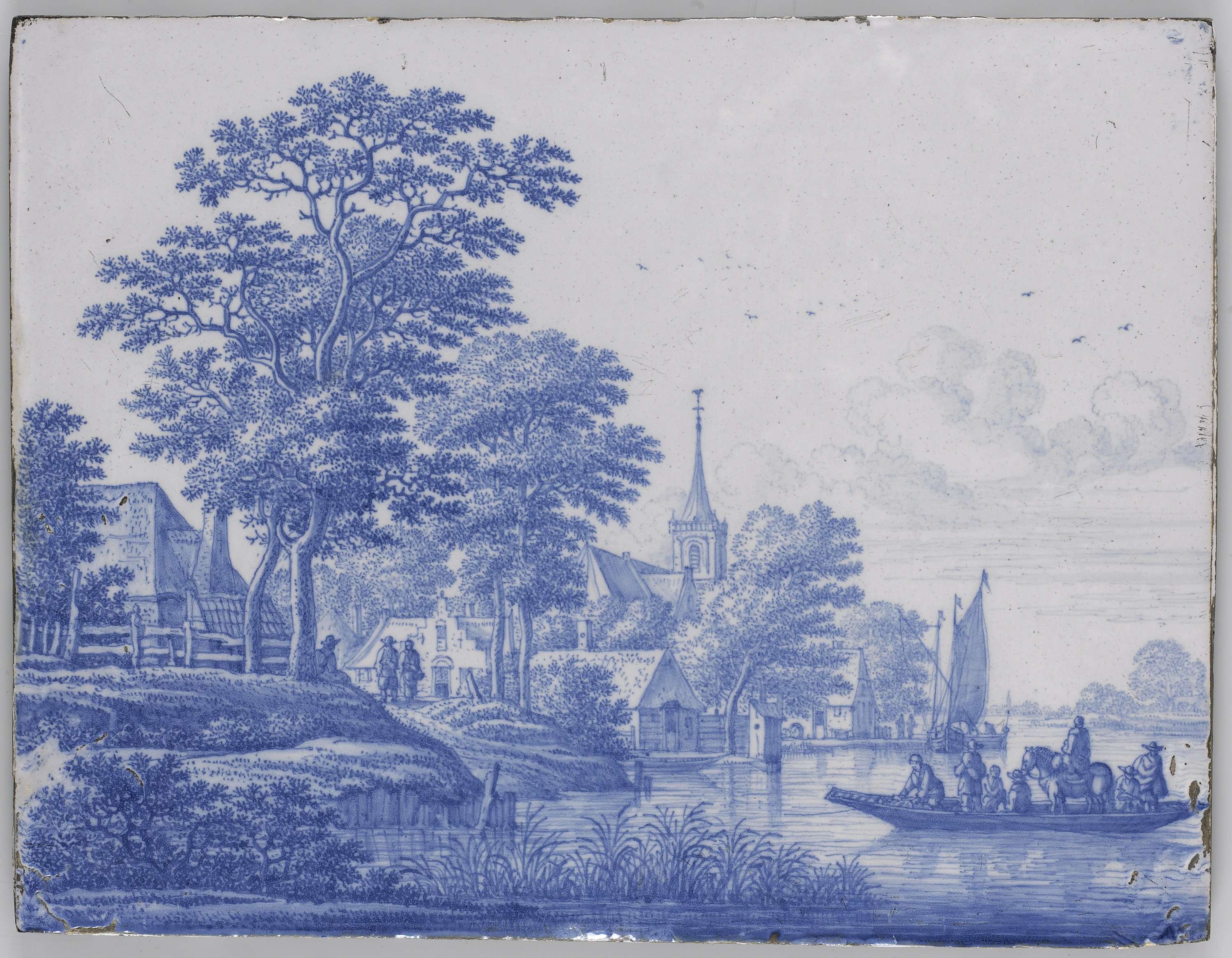Plaat van faïence met een rivierlandschap. Aan de linker oever een dorp met bomen en een kerk met spitsen toren. Rechts op de voorgrond een veerpont, waarop verscheidene figuren en een ruiter te paard. Op de voorgrond riet en struikgewas. (Nederlands)