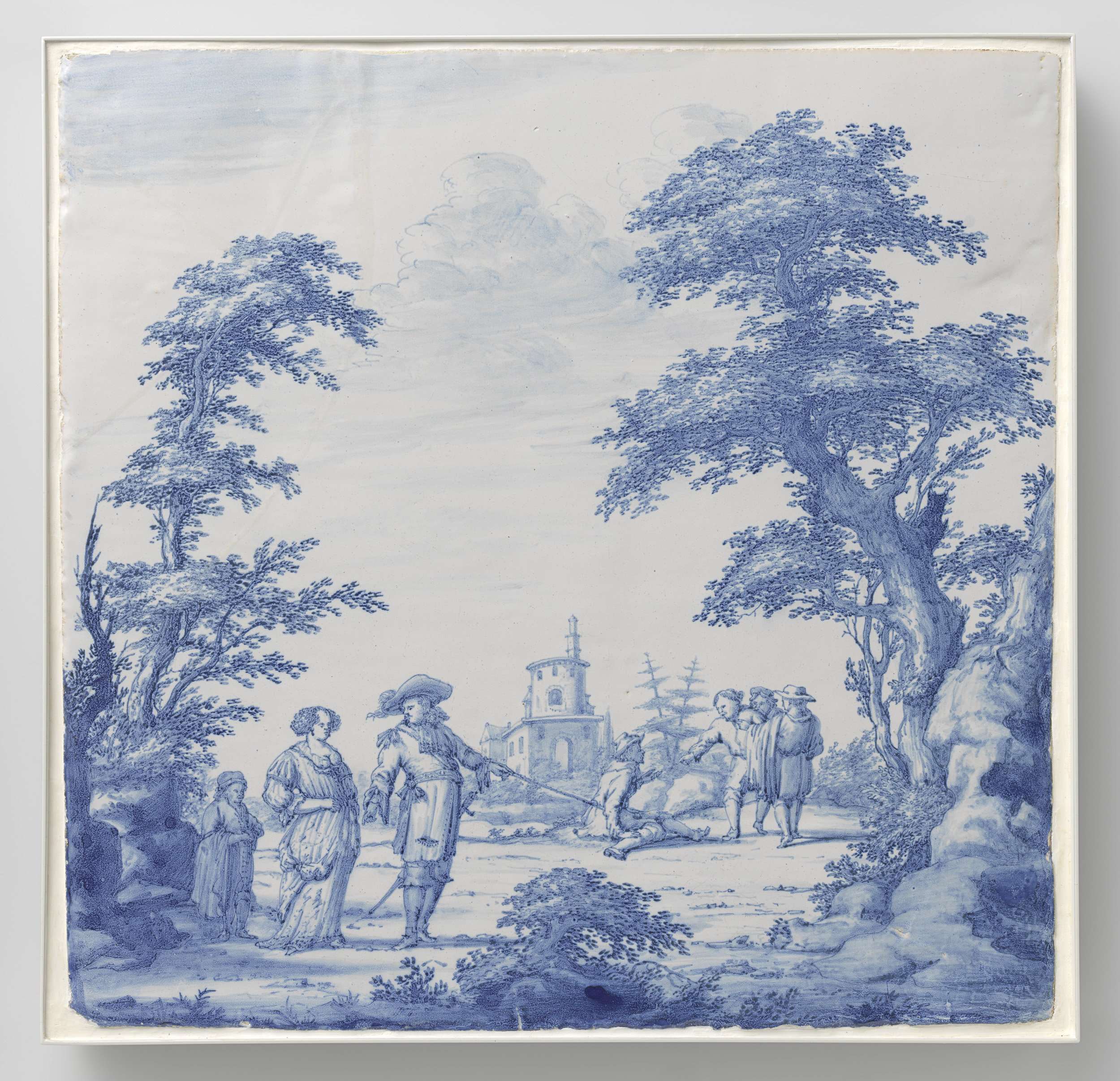 Plaat van faience, beschilderd met landschap met figuren (Nederlands)