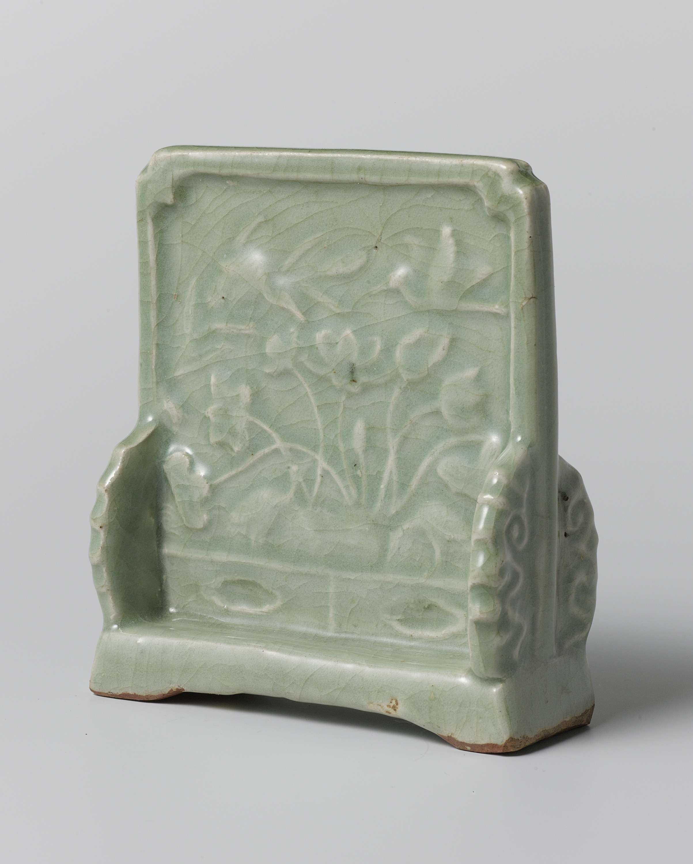 Klein tafelscherm van steengoed met aan de bovenzijde ingeknepen hoeken, bedekt met een groen glazuur. De voorzijde van het scherm met een lotusplant en vliegende vogels in reliëf. De steunen van het scherm met ranken. Celadon (Longquan). (Nederlands)