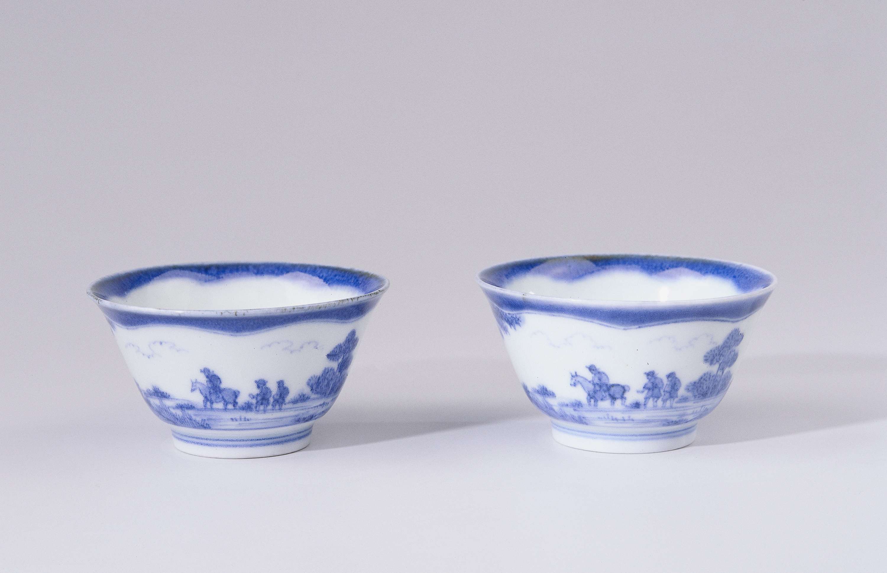 Klokvormige kop van porselein, beschilderd in onderglazuur blauw. Op de buitenwand een landschap met daarin een ruiter en twee lopende mensen tussen bomen en rotsen. Op de bodem een huis met een boom en een omheinde tuin; de binnenrand met een blauwe band. Gemerkt op de onderzijde met een vier-karakter Ming merk. Arita, blauw-wit. (Nederlands)