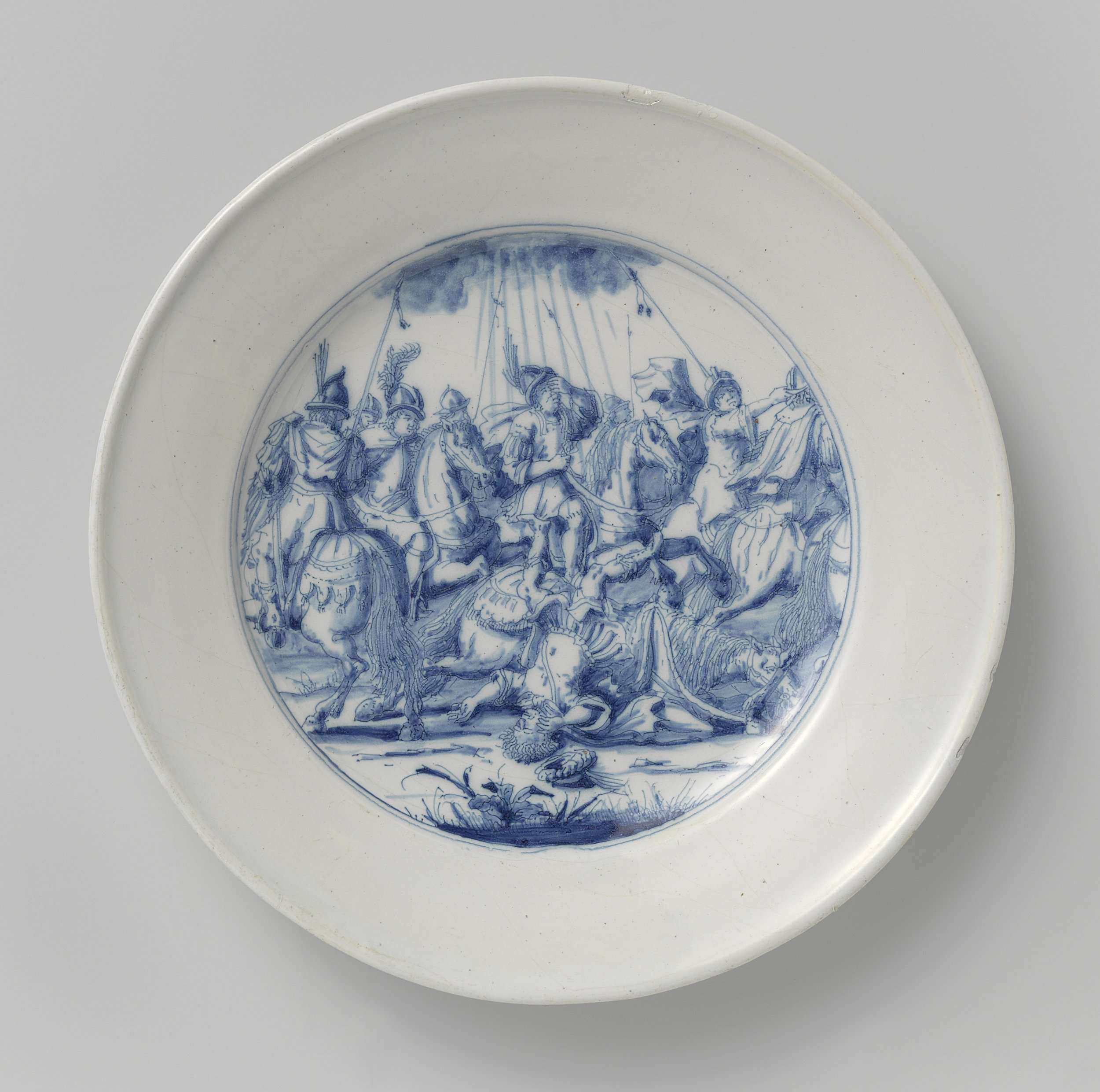 Bord van faïence, het plat beschilderd met de bekering van Paulus (Nederlands)