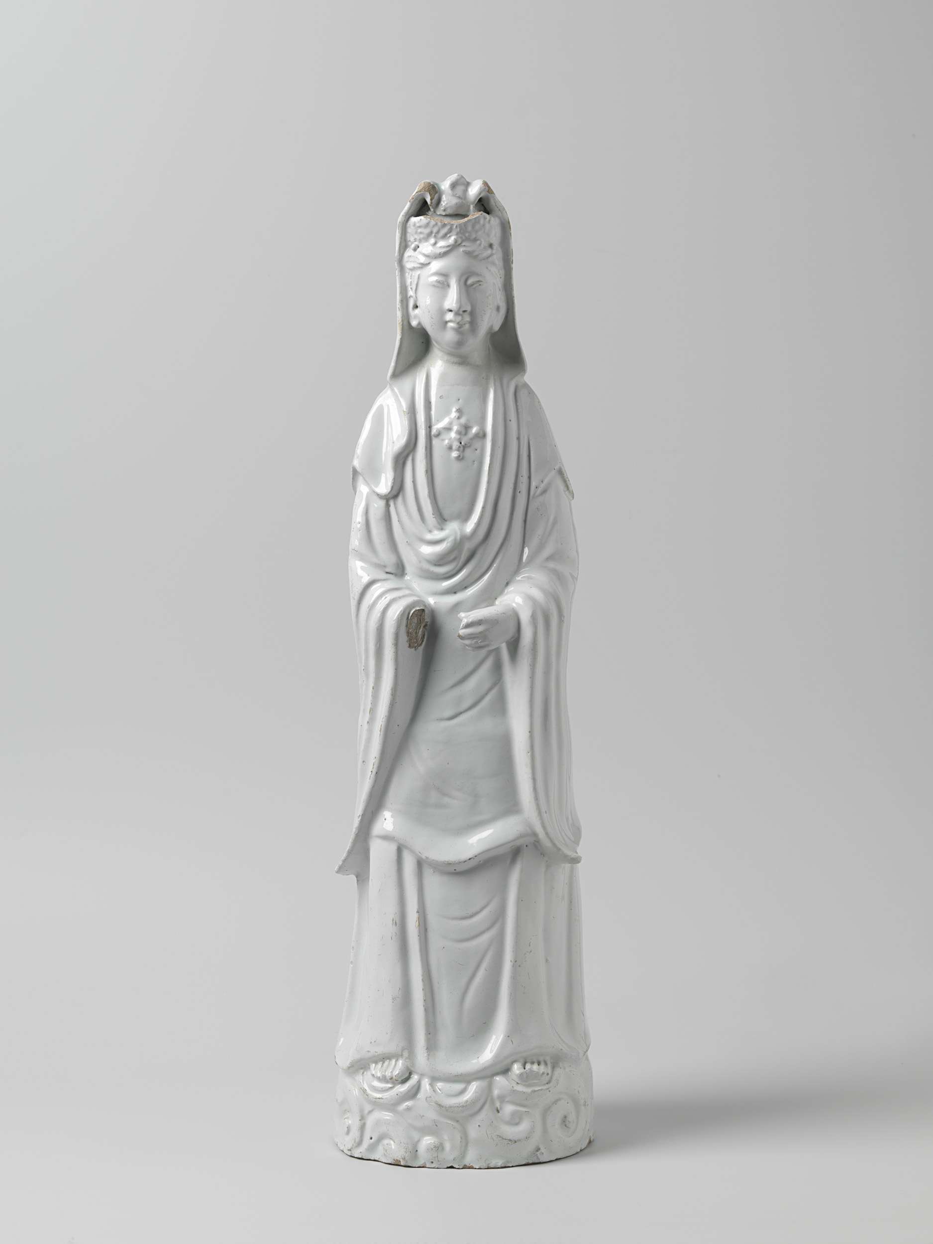 Vrouwenfiguur van faience, voorstellende Guanyin. Wit geglazuurd. (Nederlands)
