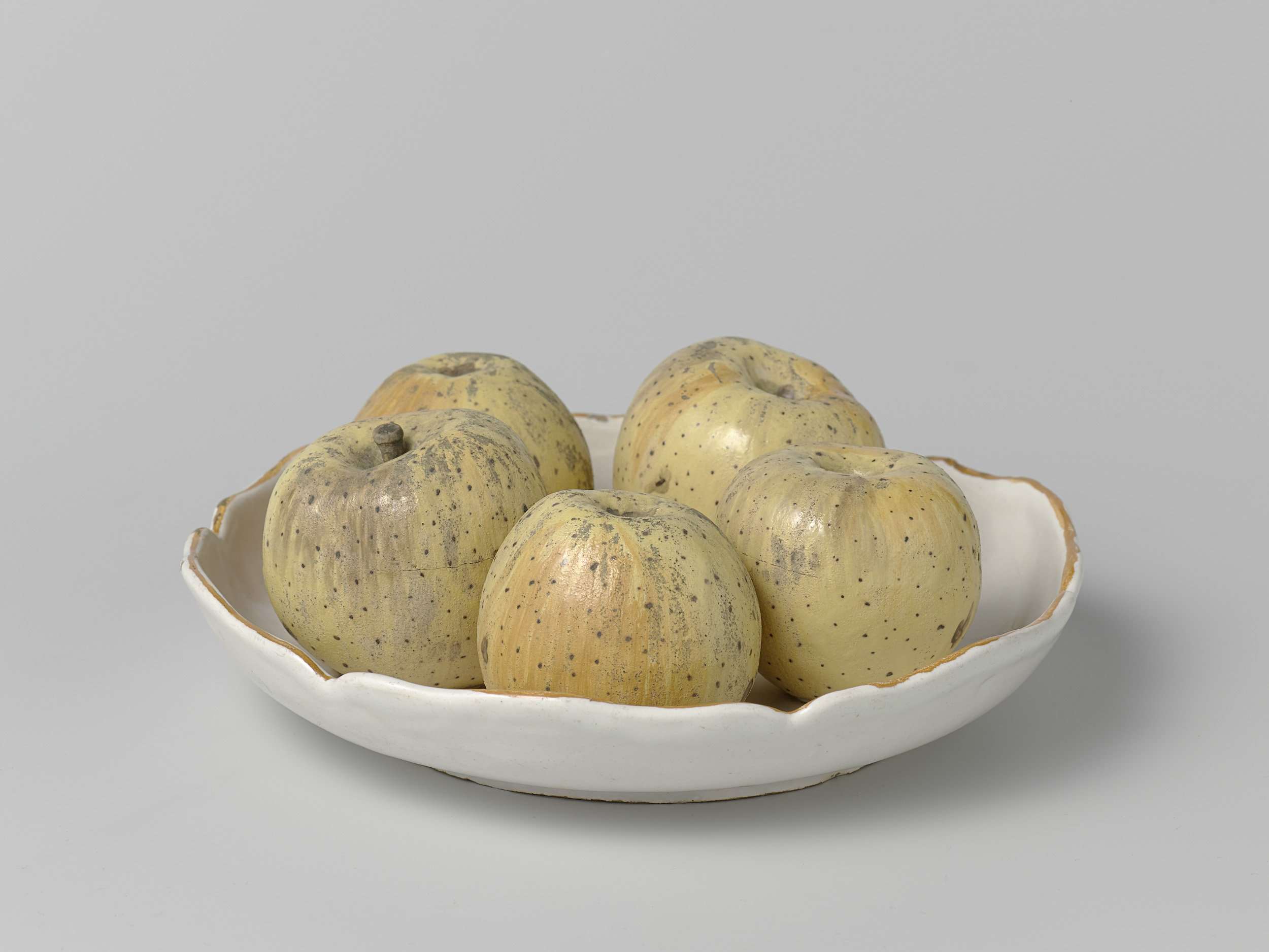| Nederlands | Schotel met geschulpte rand en vijf opgelegde appels |