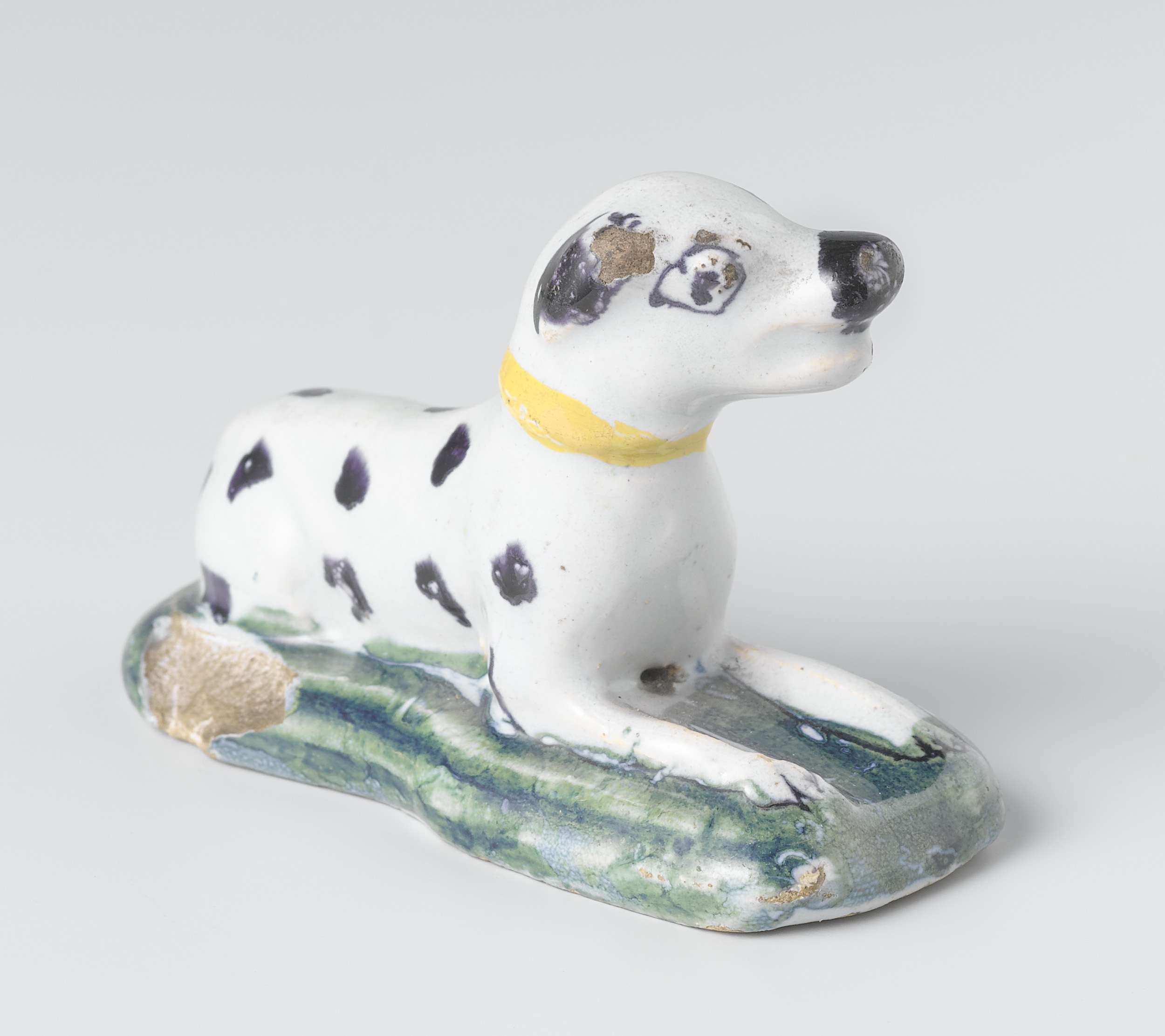 Liggend hondje van faience. Veelkleurig beschilderd. (Nederlands)