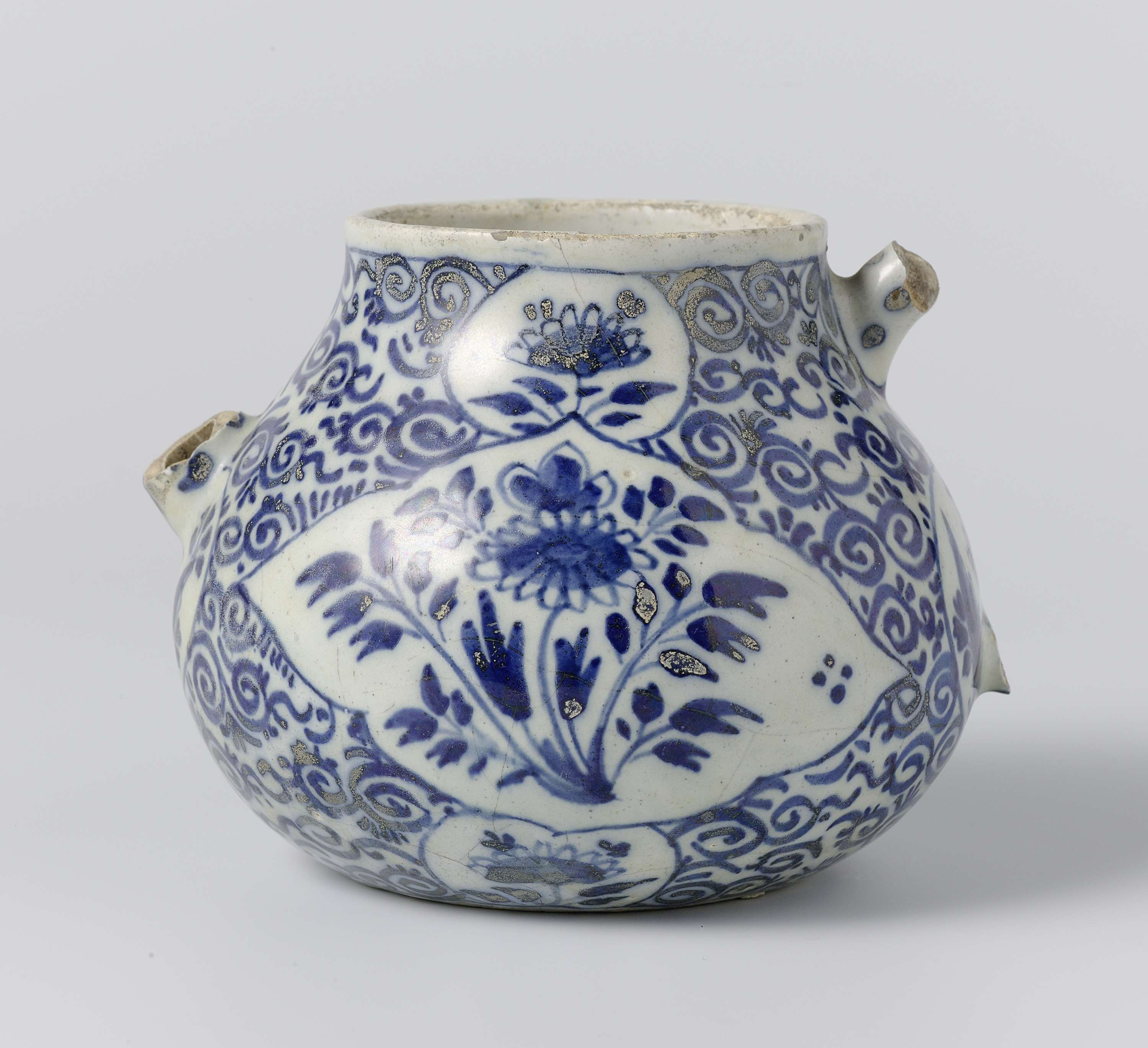 Theepot van faience. Blauw beschilderd met ranken en bloemen. Oor en tuit zijn afgebroken. (Nederlands)
