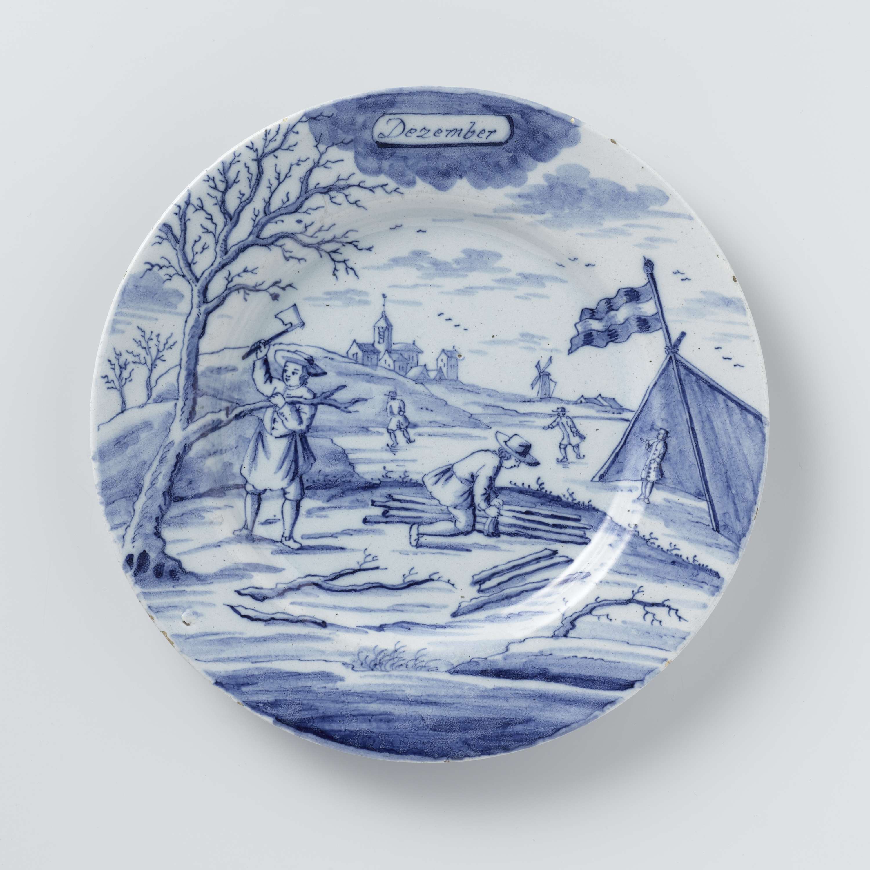 Bord van faience, uit de serie de 12 maanden. Voorstellende de maand december. Afgebeeld zijn: de houthakkers, met de tekst: Dezember. (Nederlands)