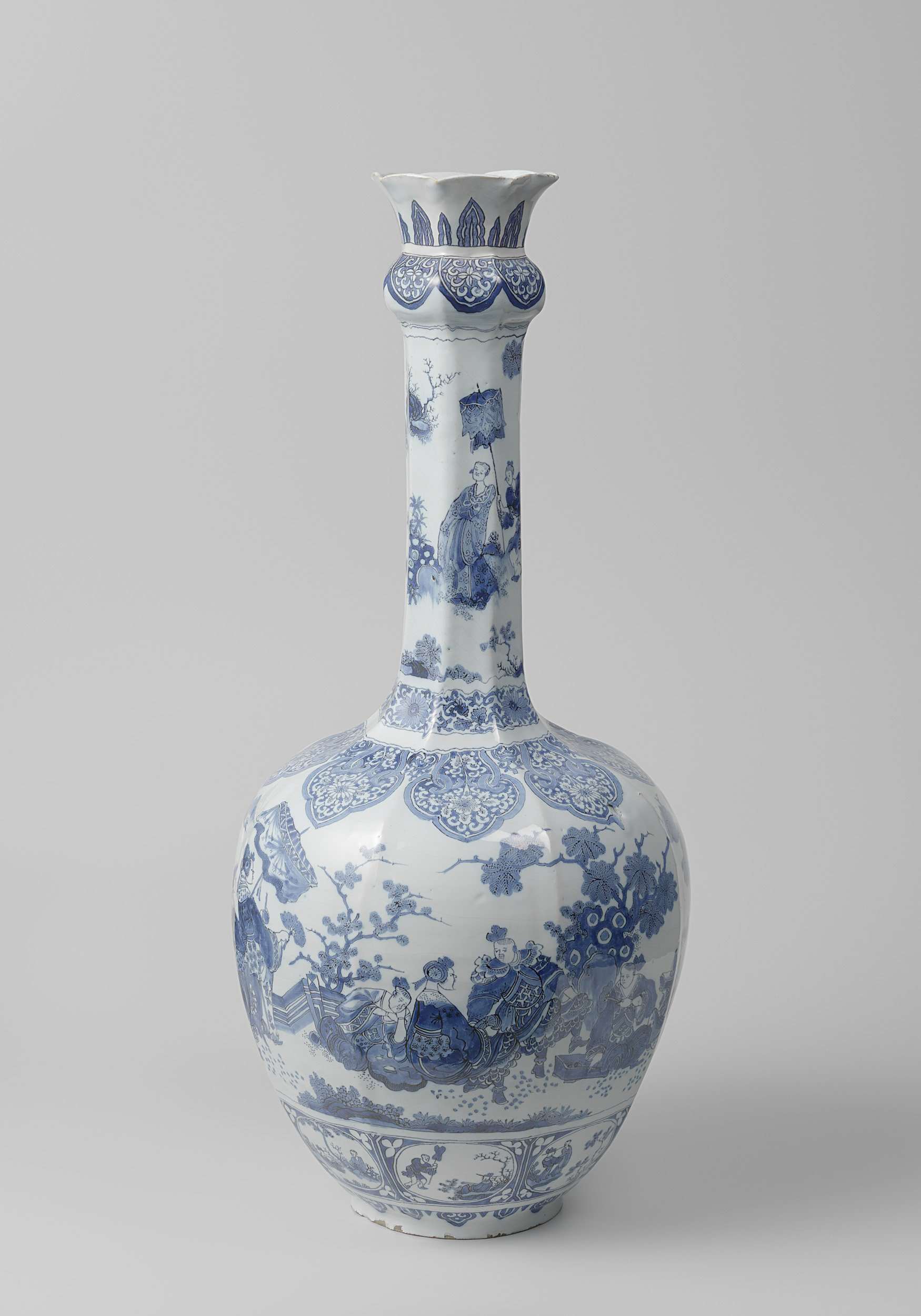 Achthoekige vaas van blauw beschilderde faience. De buik is canopisch en de hals is slank en lang en heeft een bol onder de naar buiten uitstaande mondrand. De vaas is beschilderd in de stijl van het Chinese overgangsporselein. Op de buik is een gezelschap (Chinezen) in een landschap geschilderd en boven de voet ovalen waarin figuren (Chinezen) in een landschap. De vaas is gemerkt en bij de vaas hoort een identieke vaas met invnr. BK-1984-160-a. (Nederlands)