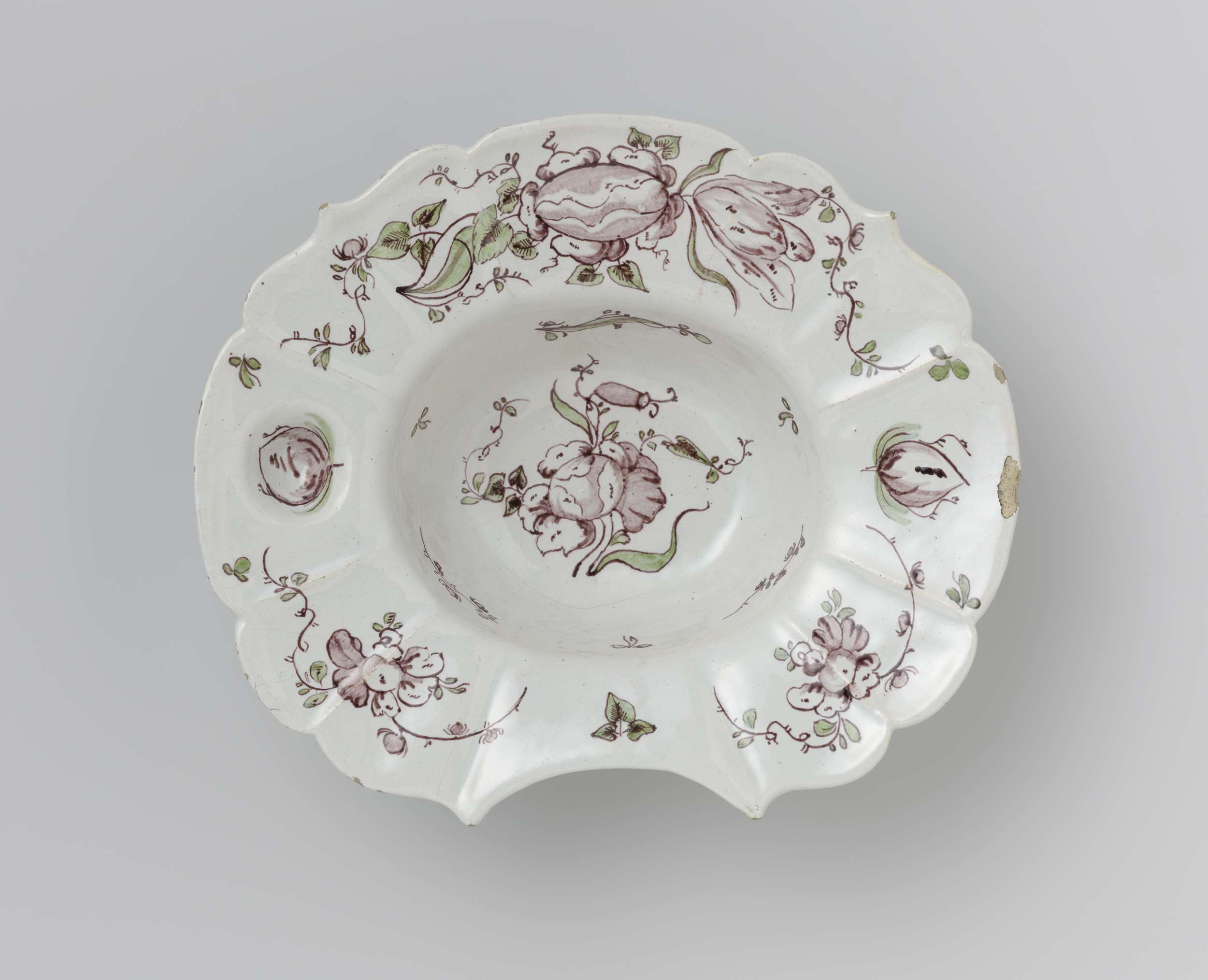 Scheerbekken van veelkleurig beschilderde faience in de kleuren groen en mangaan. Het scheerbekken is beschilderd met bloemen en bloemenranken en is gemerkt. (Nederlands)