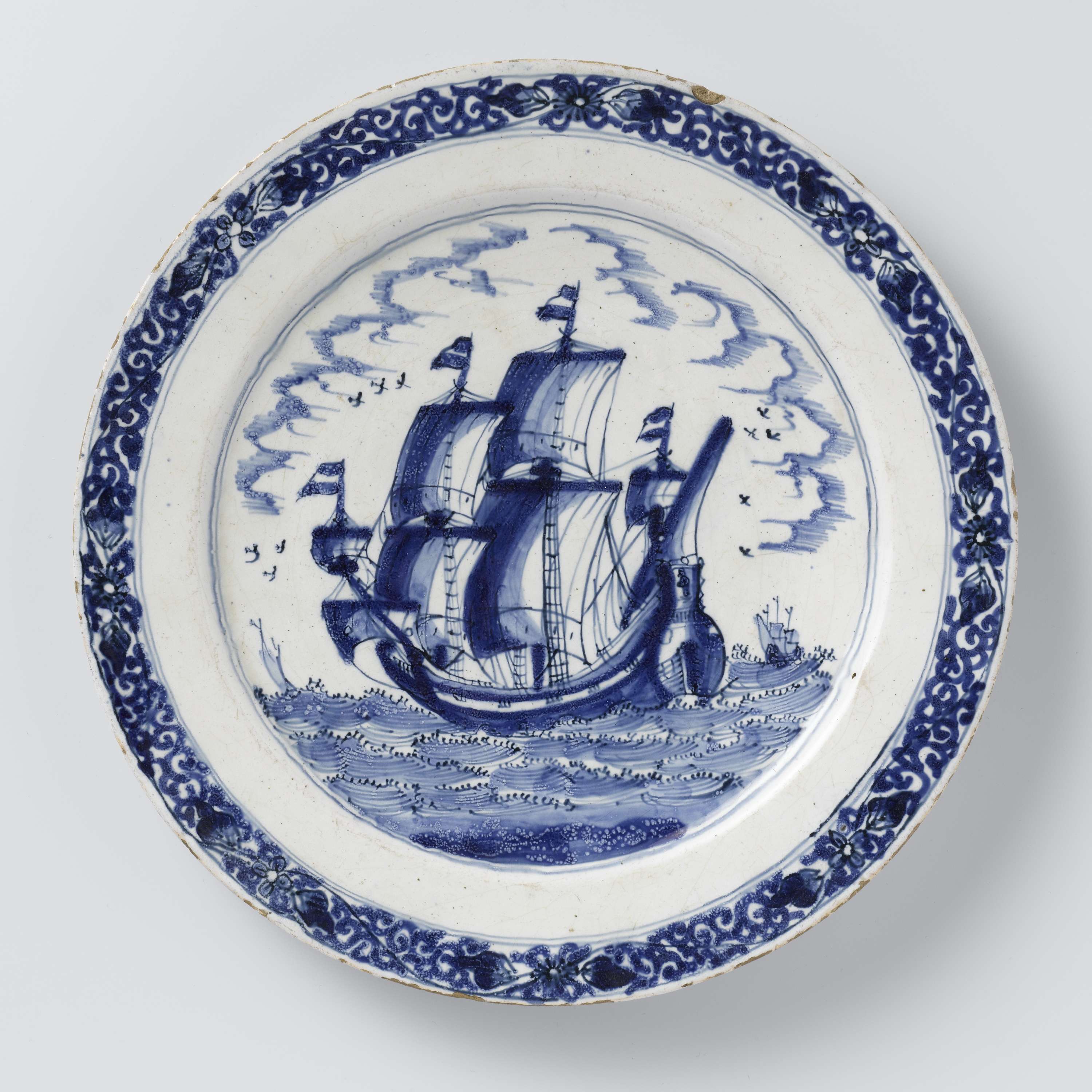 Rond bord van blauw beschilderde faience, met op het plat vier zeilende schepen. Het bord is in 1967 in bruikleen gegeven aan het Goltzius Museum in Venlo. Bij het bord horen drie identieke borden met de invnrs. BK-NM-11168-b, BK-NM-11168-c en BK-NM-11168-d. (Nederlands)