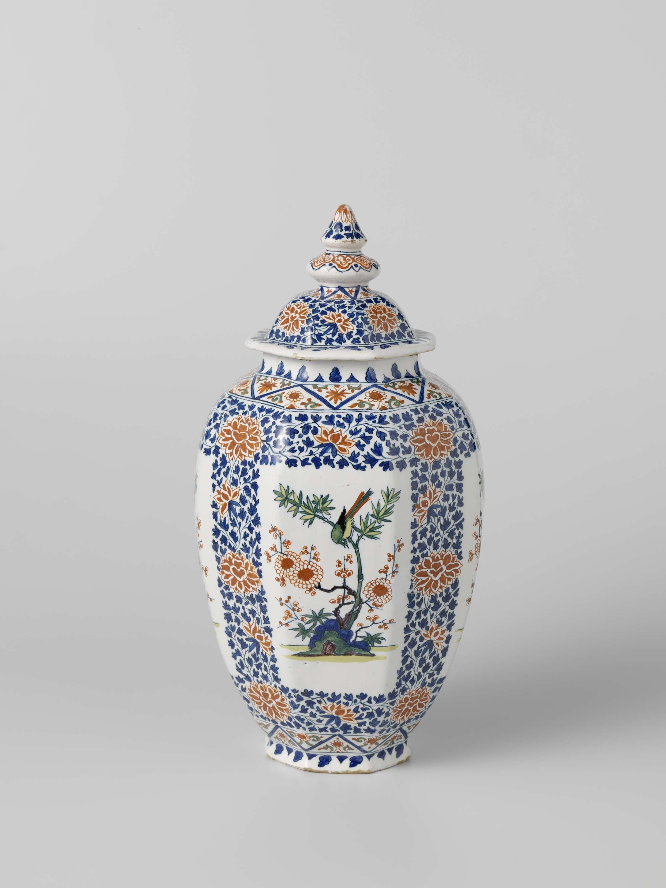 Omgekeerd eivormige, achtkantige pot van veelkleurig beschilderde faience, met een deksel. De pot is in Kakiemon-stijl beschilderd. Tussen bloemenbanden zijn langwerpige perken waarin een bloeiende boom op een grond is geschilderd. In de boom zit een vogel. De pot is gemerkt. (Nederlands)
