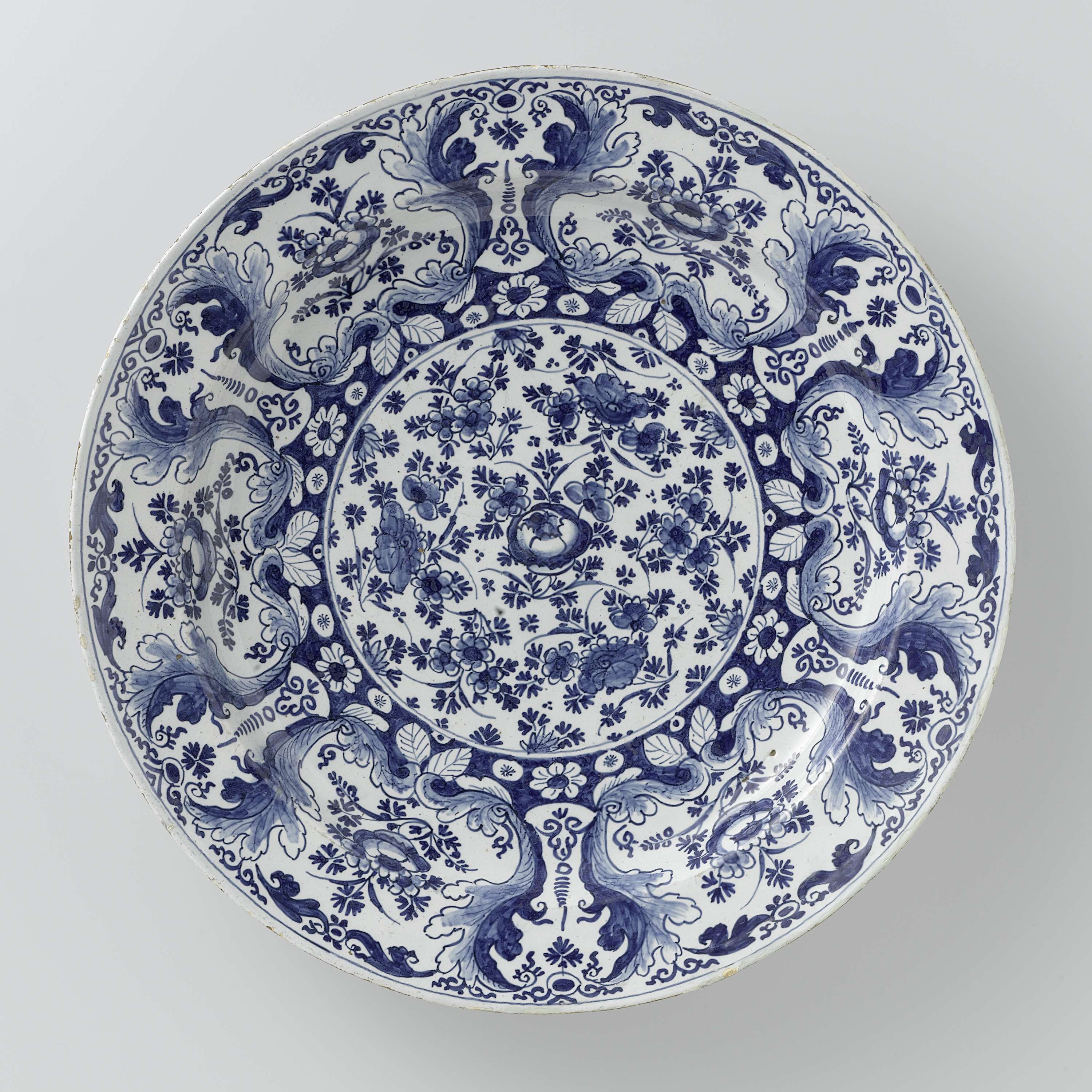 Schotel van blauw beschilderde faience. Op het plat is een cirkel geschilderd waarbinnen bloemenranken. Op de rand zijn zes vakken omlijst door bladeren geschilderd waarbinnen een bloementak. Het bord is gemerkt en hoort bij twee identieke borden met invnr. BK-14968-a en BK-14968-b. (Nederlands)