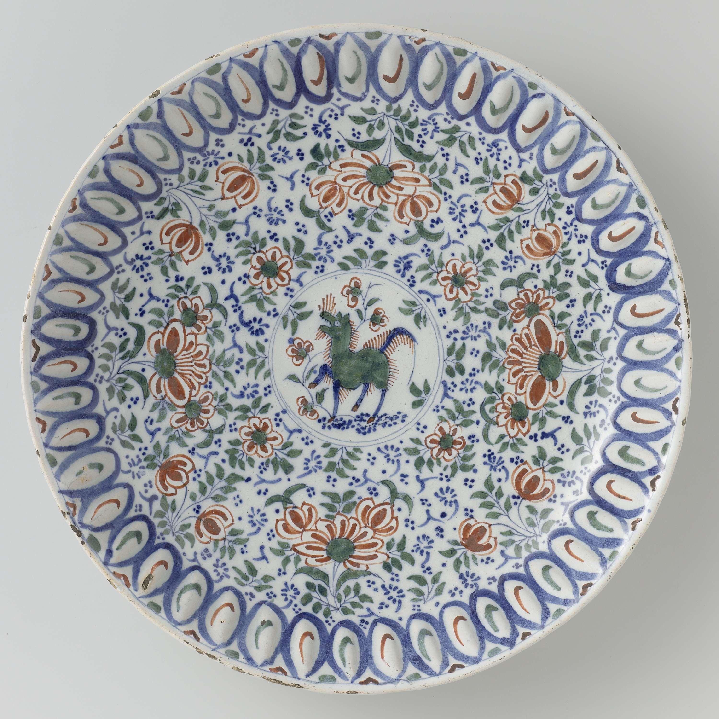 Schotel van faience. Veelkleurig beschilderd met bloemen en een beest in het midden. (Nederlands)