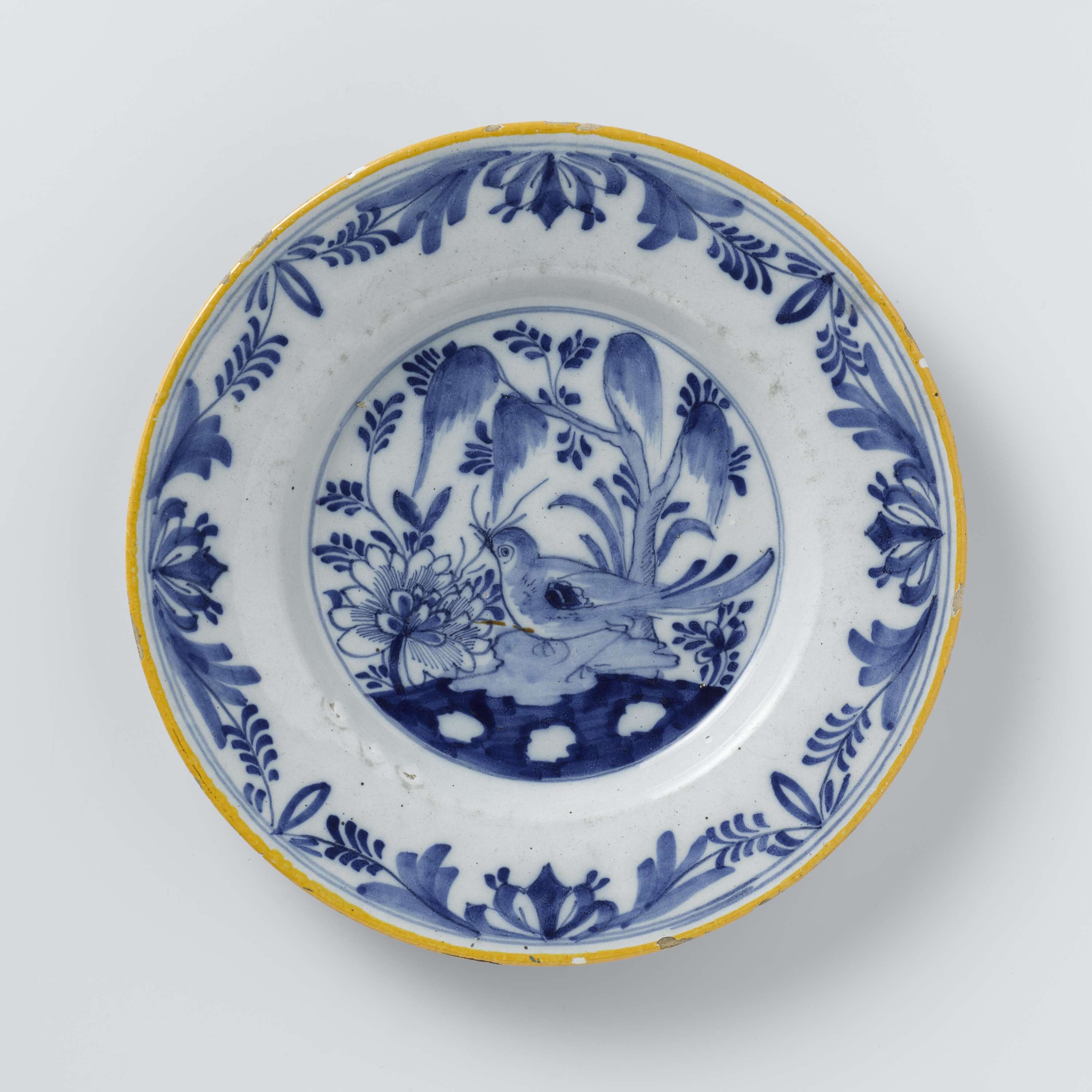 Bord van faience, met gele bies. Blauw beschilderd met een vogel in een landschap. (Nederlands)