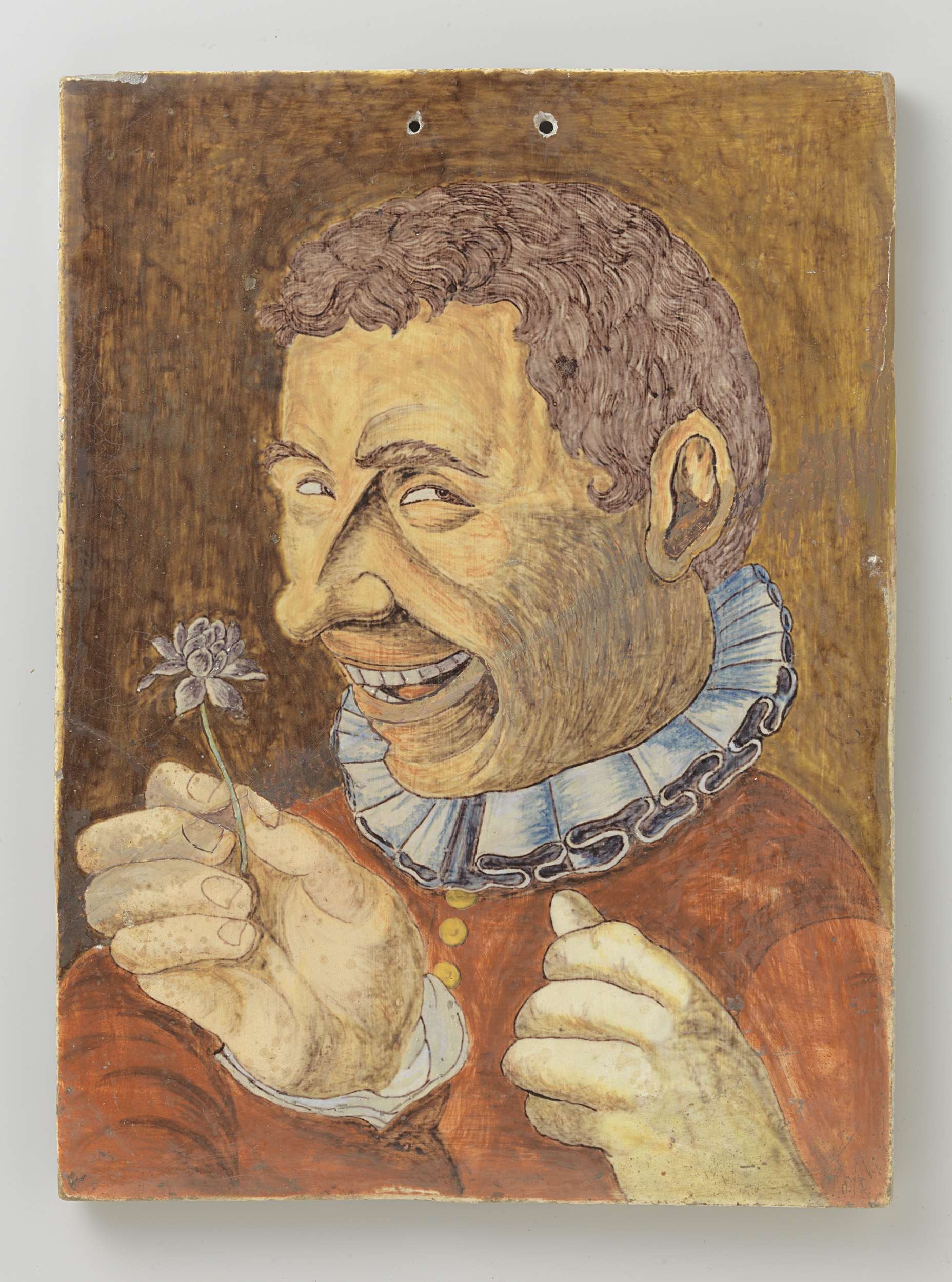 plaat van faïence. Beschilderd met een portret van een lachende man met een bloem in de hand. (Nederlands)
