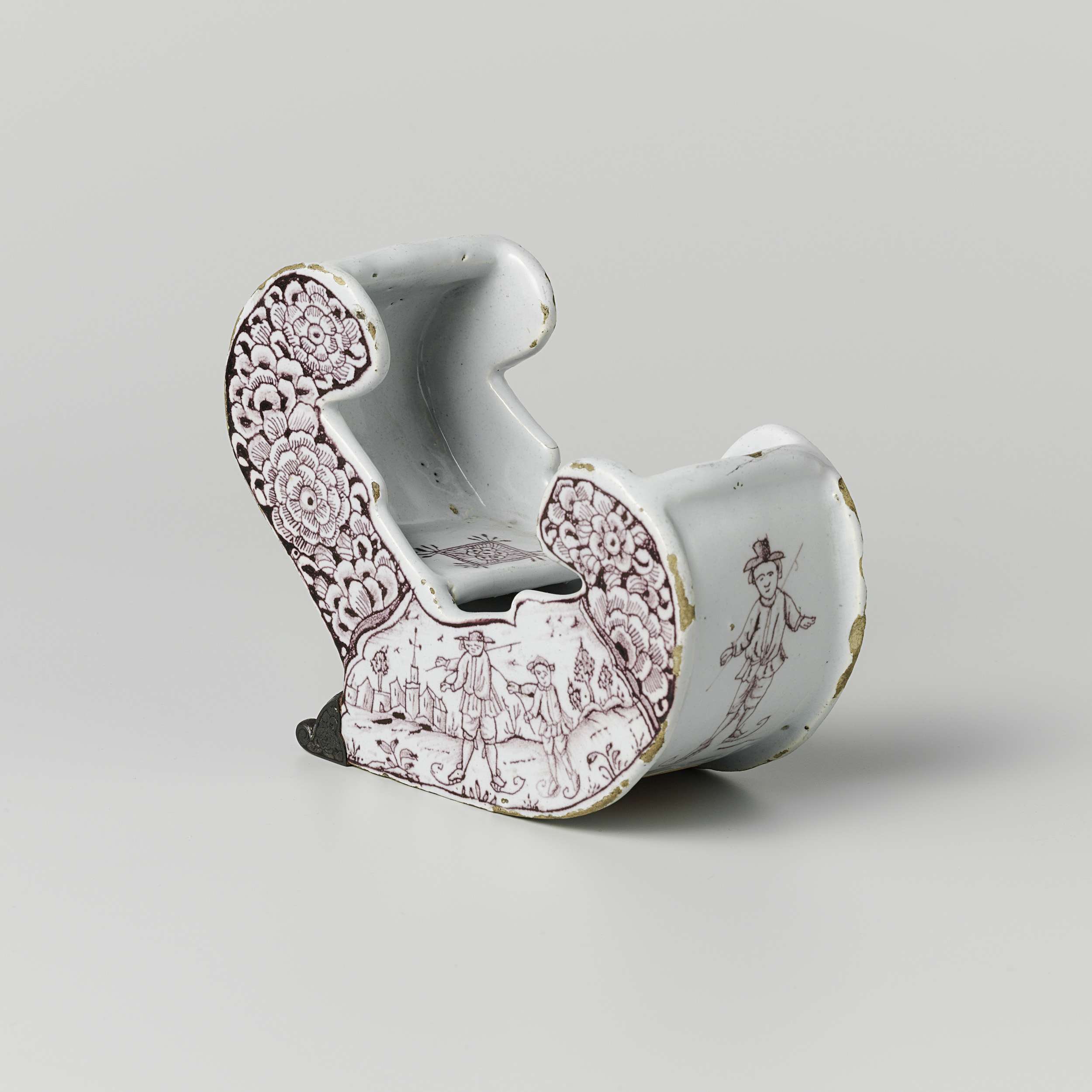 Sleetje van faience. Paars beschilderd met bloemen en schaatsers (Nederlands)