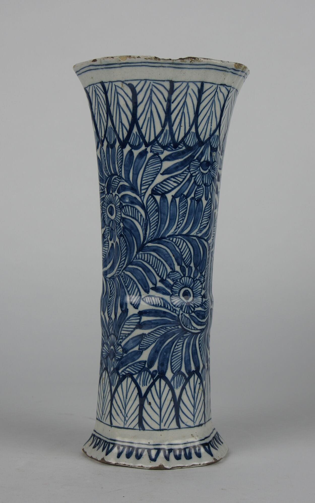 Driedelig kaststel bestaande uit een balustervormige, geribde dekselvaas met klokvormig deksel waarop een zittende leeuw. Bekervazen zijn geribd. Beschildering in blauw met florale motieven. Schade aan de randen. (Nederlands)