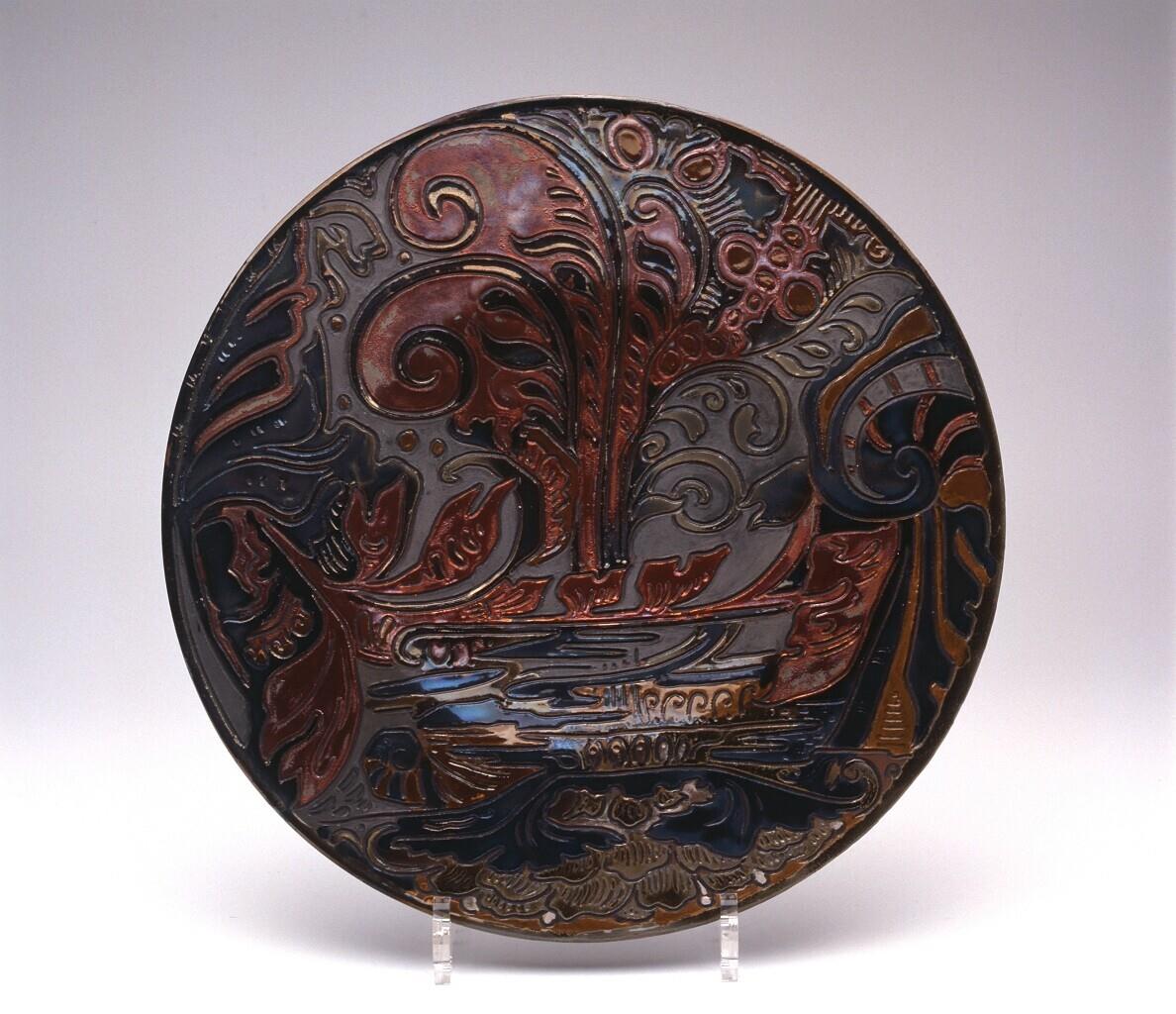 Schotel met brede, schuin oplopende rand. Ingekraste decoratie van een lineair patroon, in rood, groen, blauw en bruin Reflet Métallique. (Nederlands)