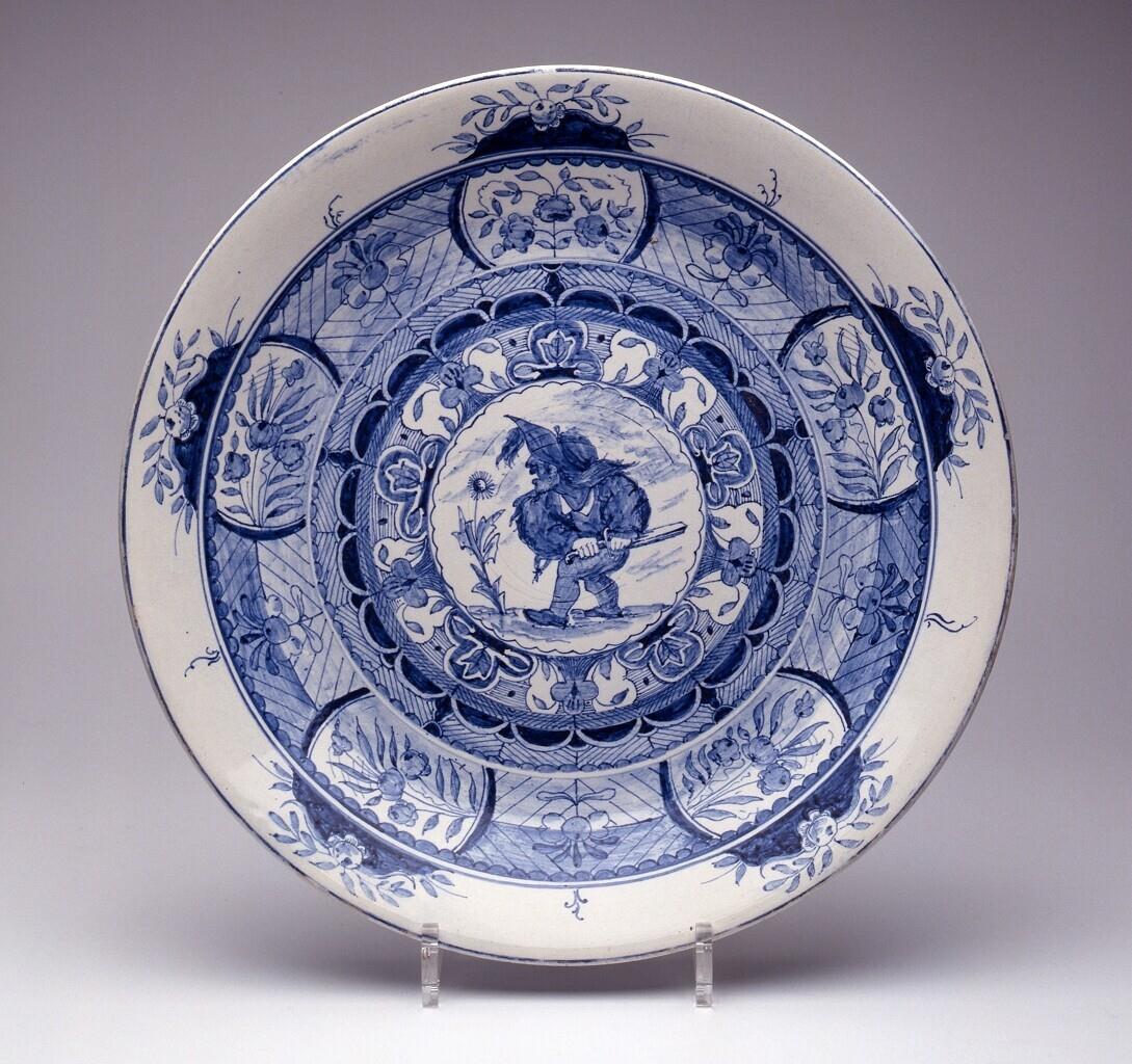 De schotel, met standring, is centraal gedecoreerd met een gebocheld mannetje met een zwaard en een bloem. Deze voorstelling wordt omcirkeld door decoratieve banden met ondermeer gestileerd bloem- en bladwerk. (Nederlands)