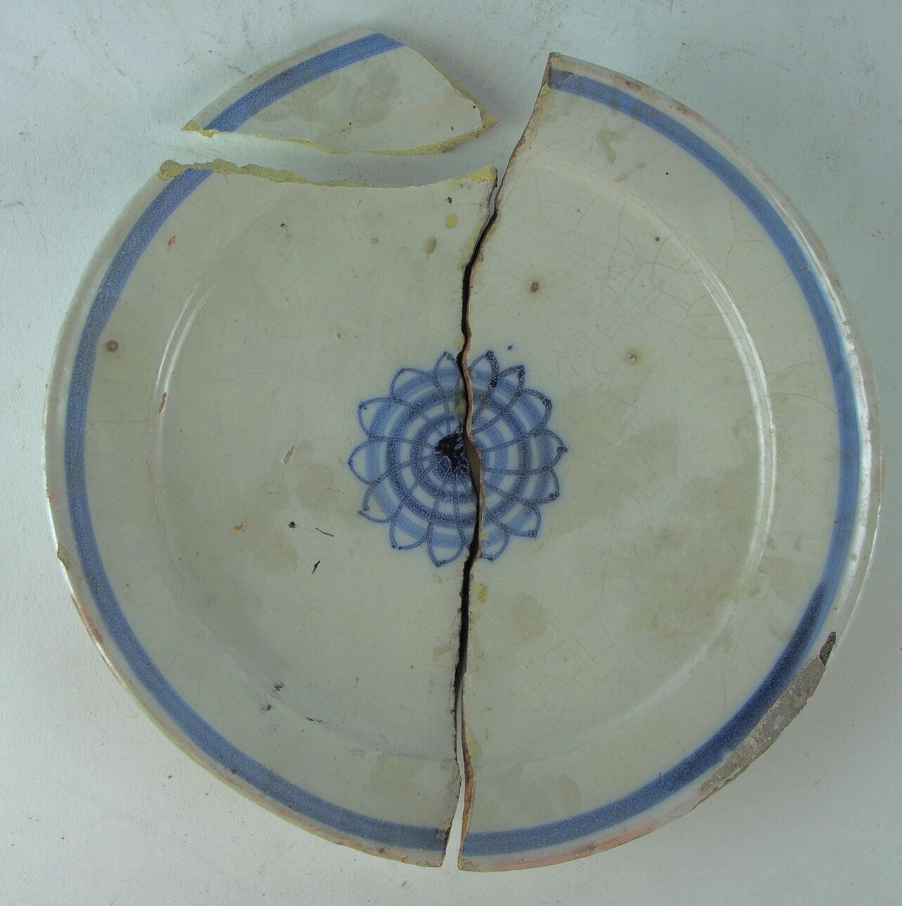 monochroom blauw met rozet in het midden en blauwe rand. Bord is kapot. (Nederlands)