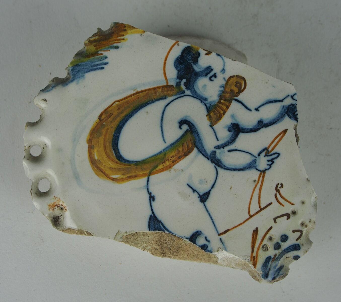 Scherf van een schaal met ajourwerk. Hoogstwaarschijnlijk compendiario uit Ligurië. De puto is uitgevoerd in geel en blauw. (Nederlands)