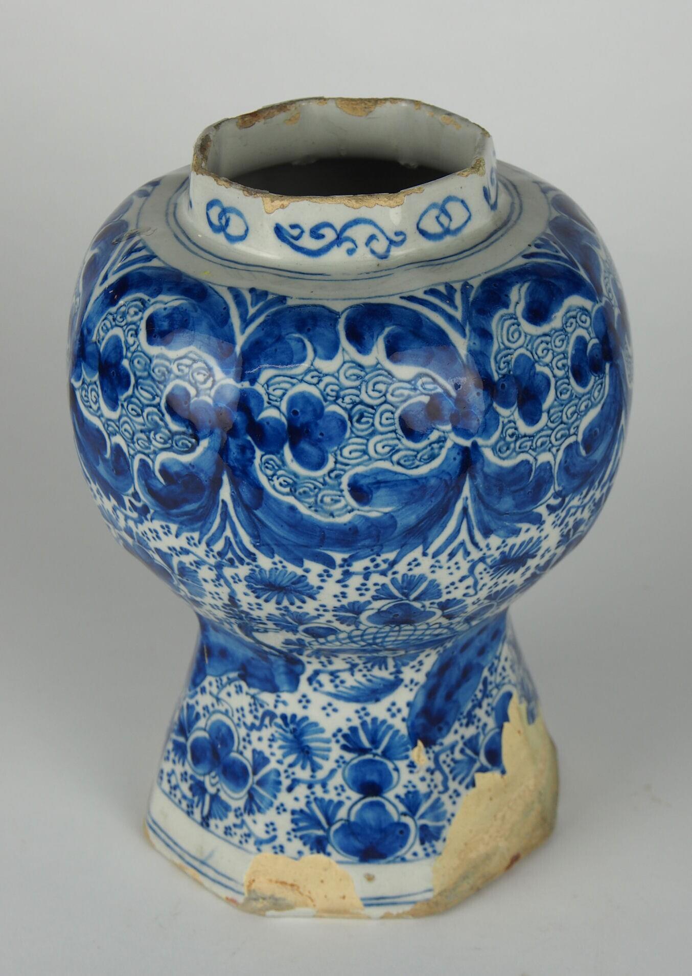 Dekselvaas, waarvan het deksel ontbreekt, gedecoreerd in blauw met bloemmotief. Glazuurschade. (Nederlands)