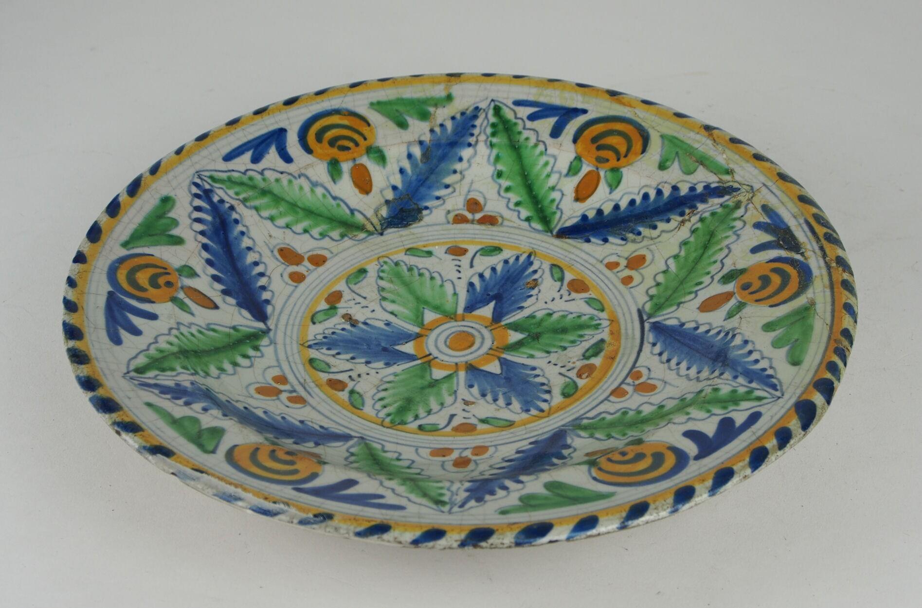 Bord met op het plat bladmotieven in de vorm van een rozet in een cirkel omgeven door bladmotieven in de vorm van een ster. Tussen de bladeren is de ruimte gevuld met drielobbige piramide. De rand is versierd met kabelmotief. Is gerestaureerd. (Nederlands)