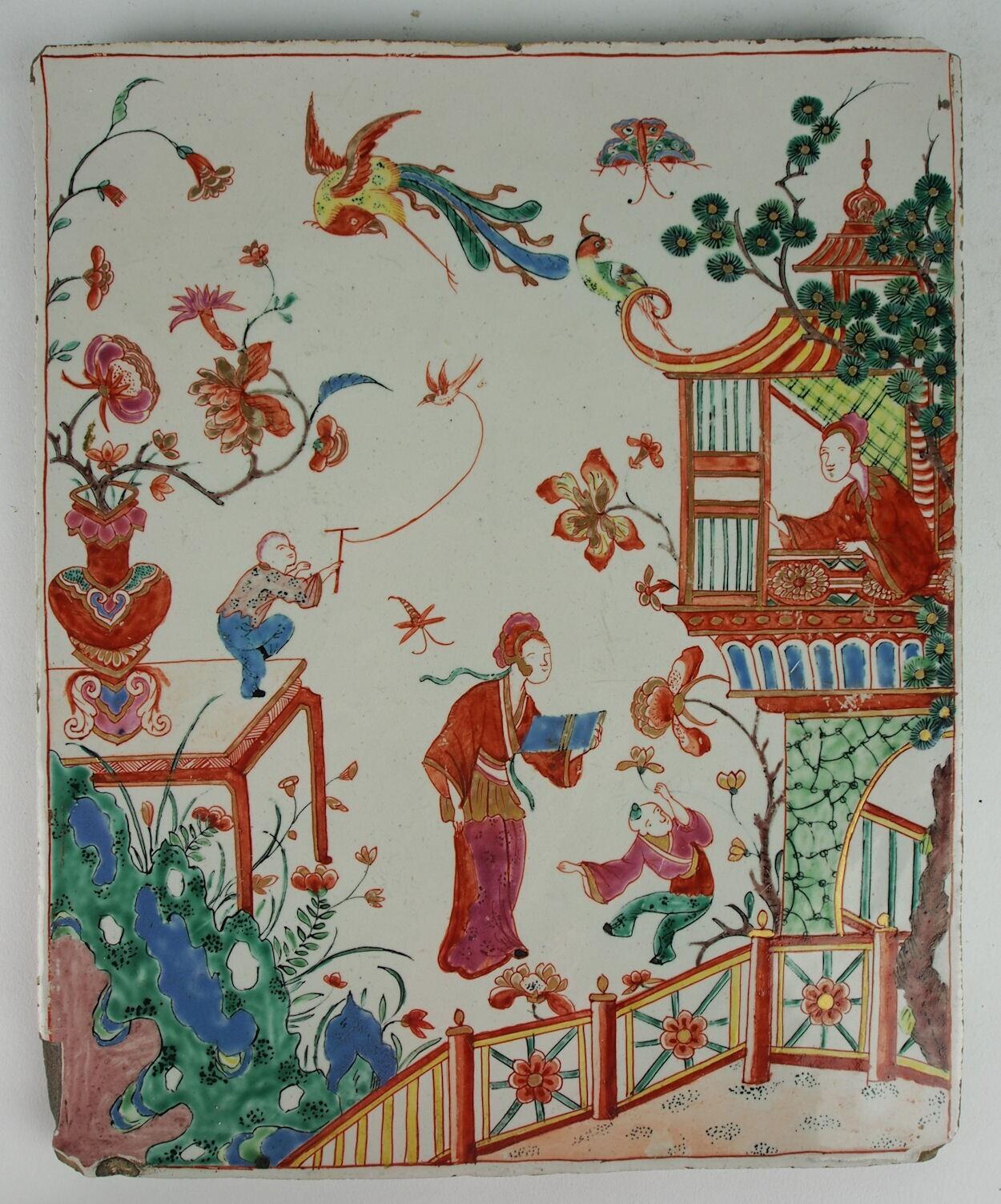 De rechthoekige plaque is aan de voorkant beschilderd met een chinoiserie voorstelling. Afgebeeld is een tuin met een hek, gestoffeerd met een Lange Lijs en een Zotje in het midden. Links van dit tafereel is een tafel geplaatst achter rotsen. Op de tafel staat een gevulde bloemenvaas en een Zotje met een stok met een touw in zijn hand. Aan het einde van het touw vliegt een vogel. Rechts in de voorstelling is een Lange Lijs in een paviljoen afgebeeld. Verder zijn er nog insecten, vogels en bloemen geschilderd. Randbeschadigingen en hoekschade. De linker onderhoek mist een stuk glazuur. (Nederlands)