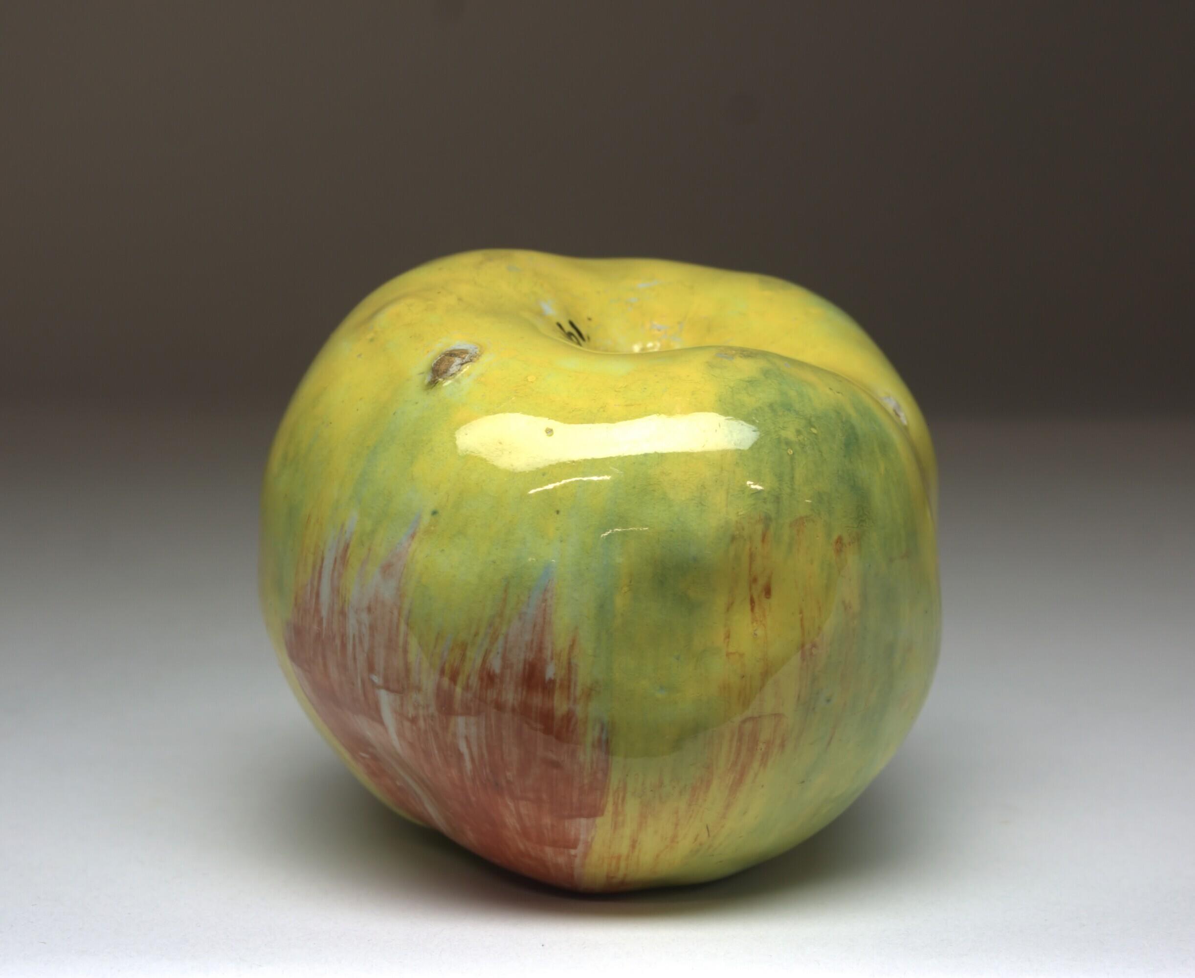 plastiek, kunstfruit van tinglazuuraardewerk, voorstellende een appel (Nederlands)