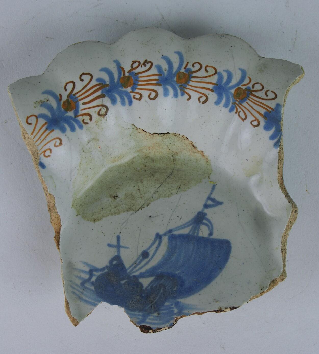 Fragment van een plooischotel gepolychromeerd in blauw en oranje. Het plat is gedecoreerd met een schip, de binnenwand met een aigretterand en de buitenwand met strepen. (Nederlands)