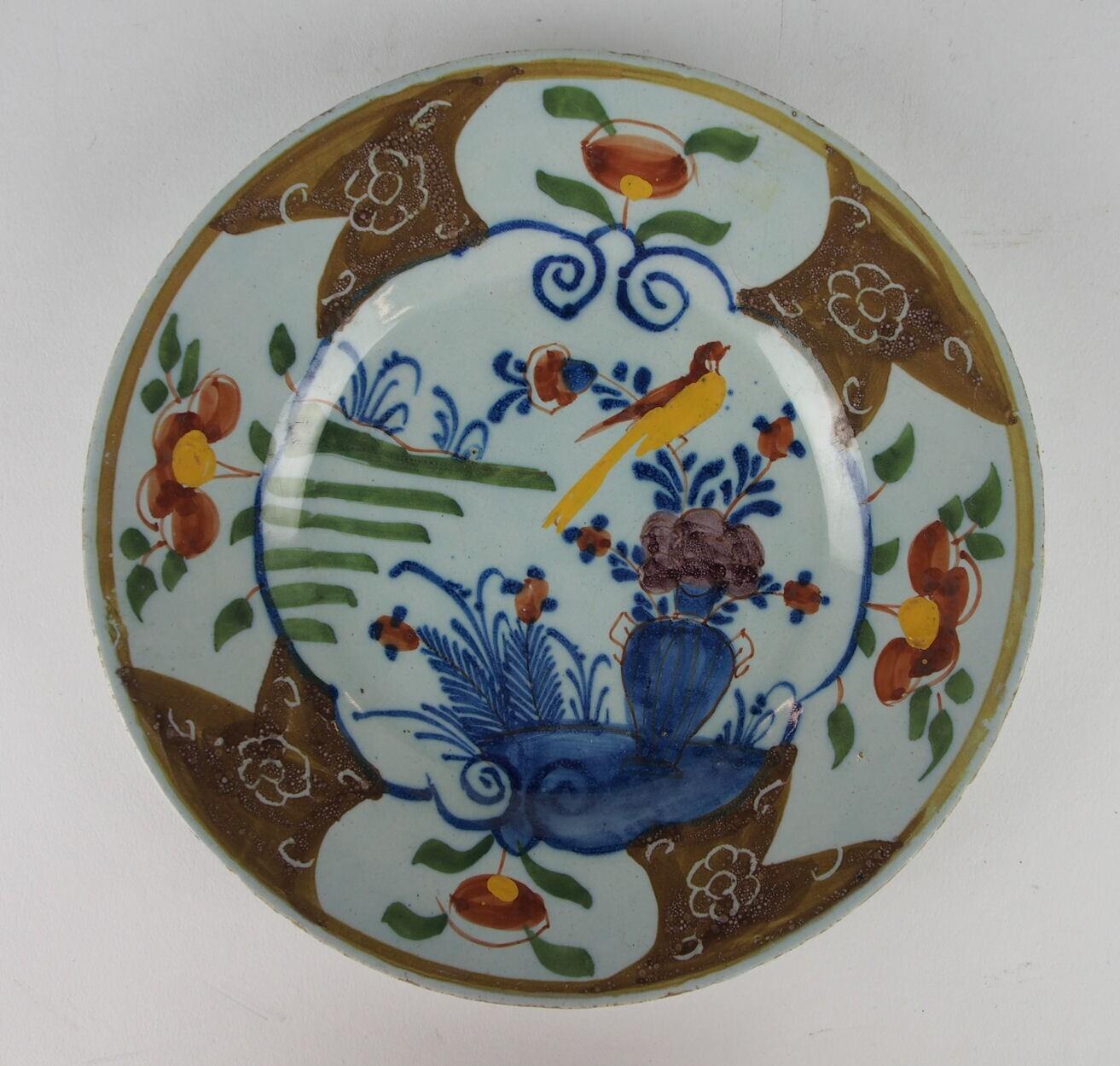 Polychromie in geel, blauw, bruin, groen, rood en mangaan. Op het plat een bloemenvaas en vogel. Op de rand vakken met bloemen. (Nederlands)