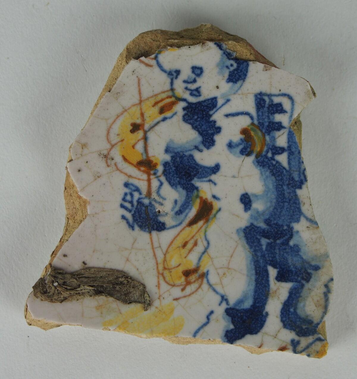 Hoogstwaarschijnlijk een compendiario-scherf uit Ligurië. De putto is uitgevoerd in geel en blauw. (Nederlands)
