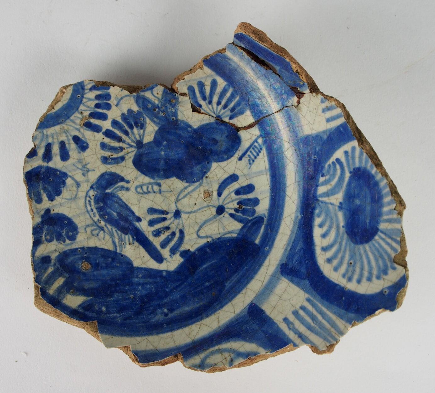Majolica fragment met rode scherf. Loodglazuur op de buitenwand. Beschildering in blauw onderglazuur. Op het plat een vogel en florale motieven. Op de wand vakken met florale motieven. (Nederlands)